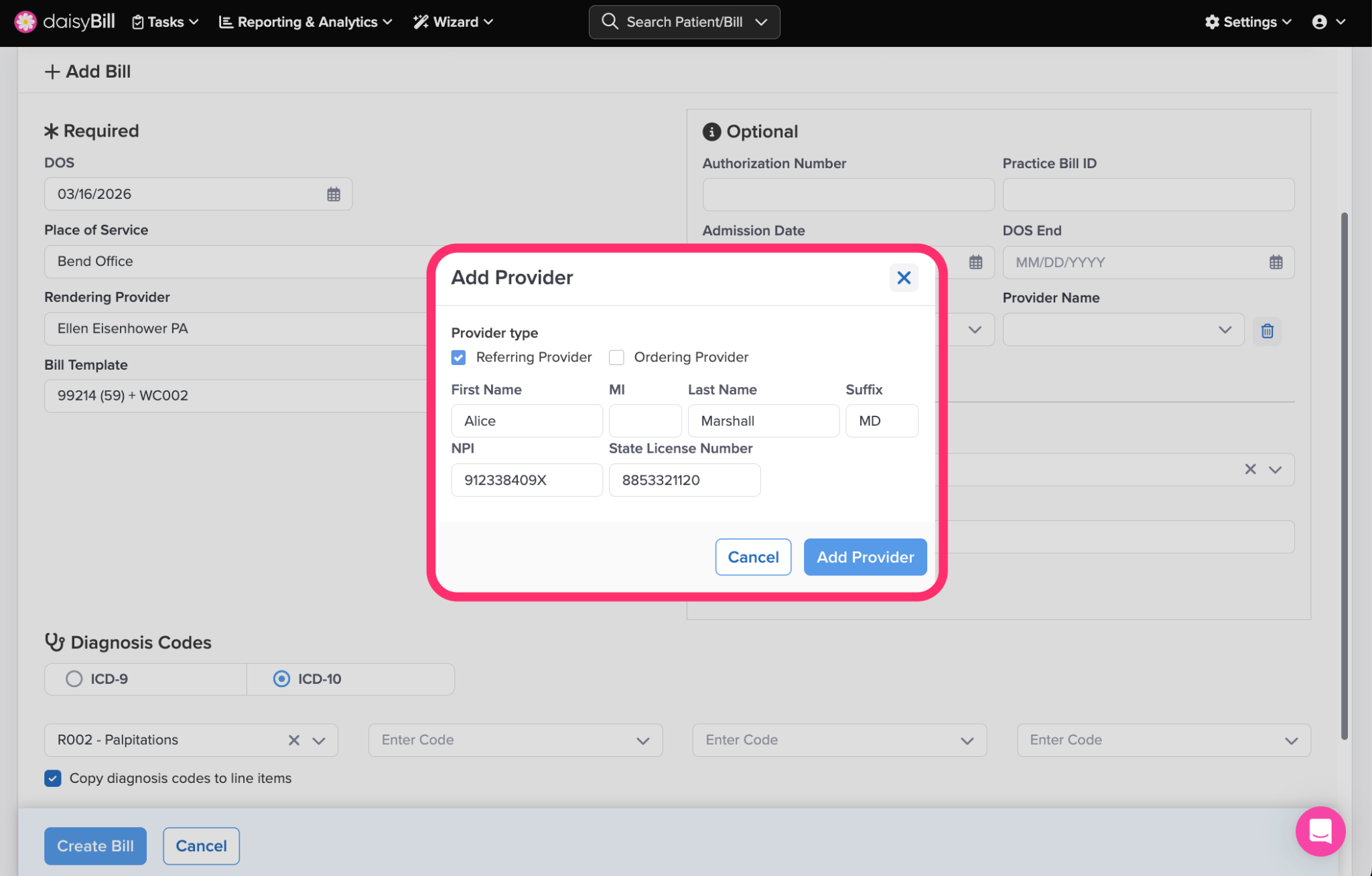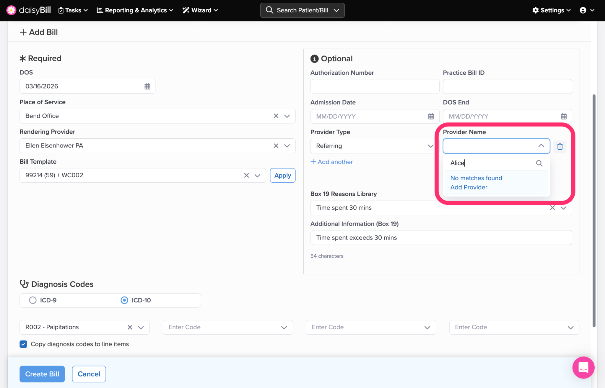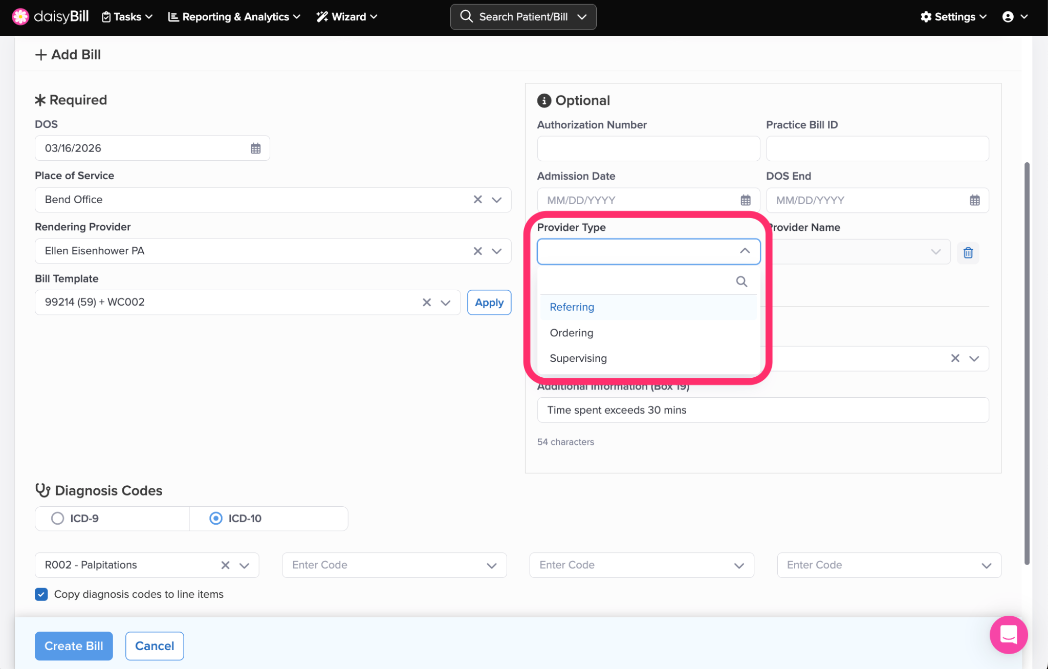 To add a Referring Provider or an Ordering Provider to a Bill, select the Provider Type in the Optional section.