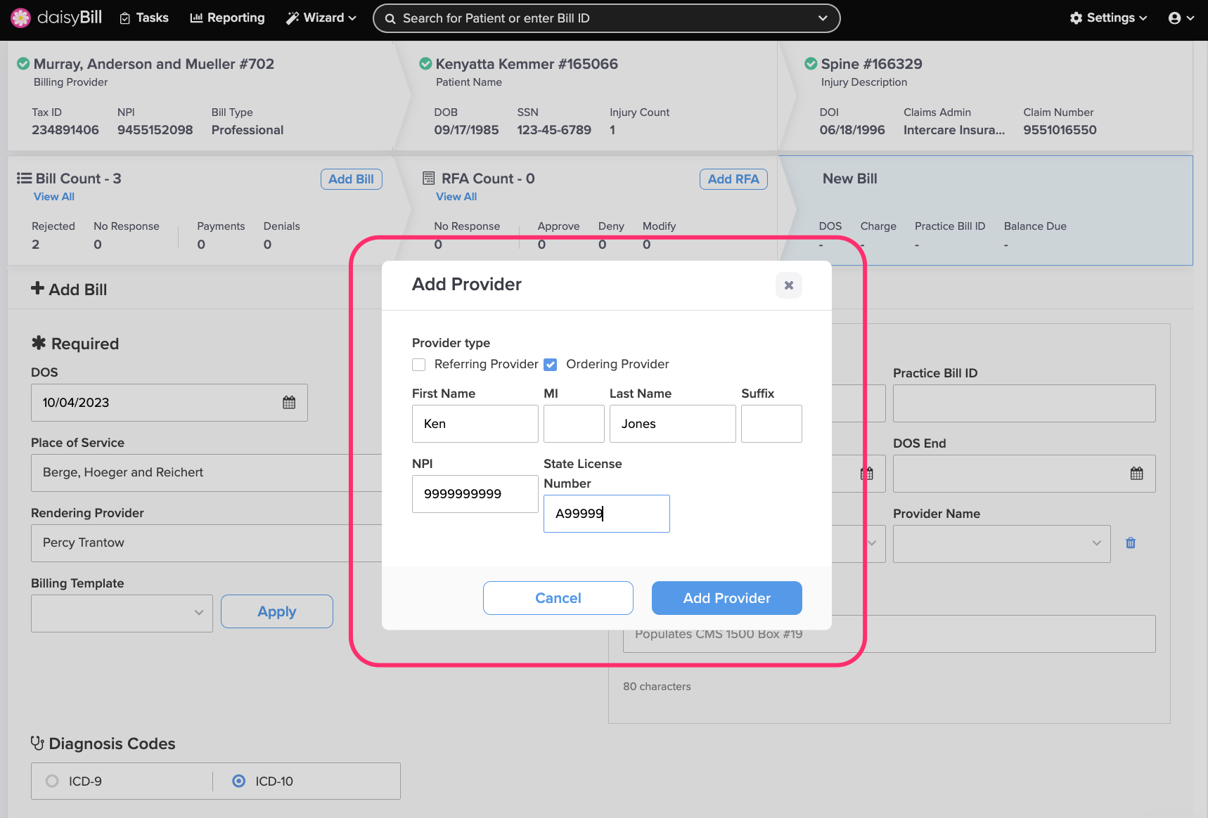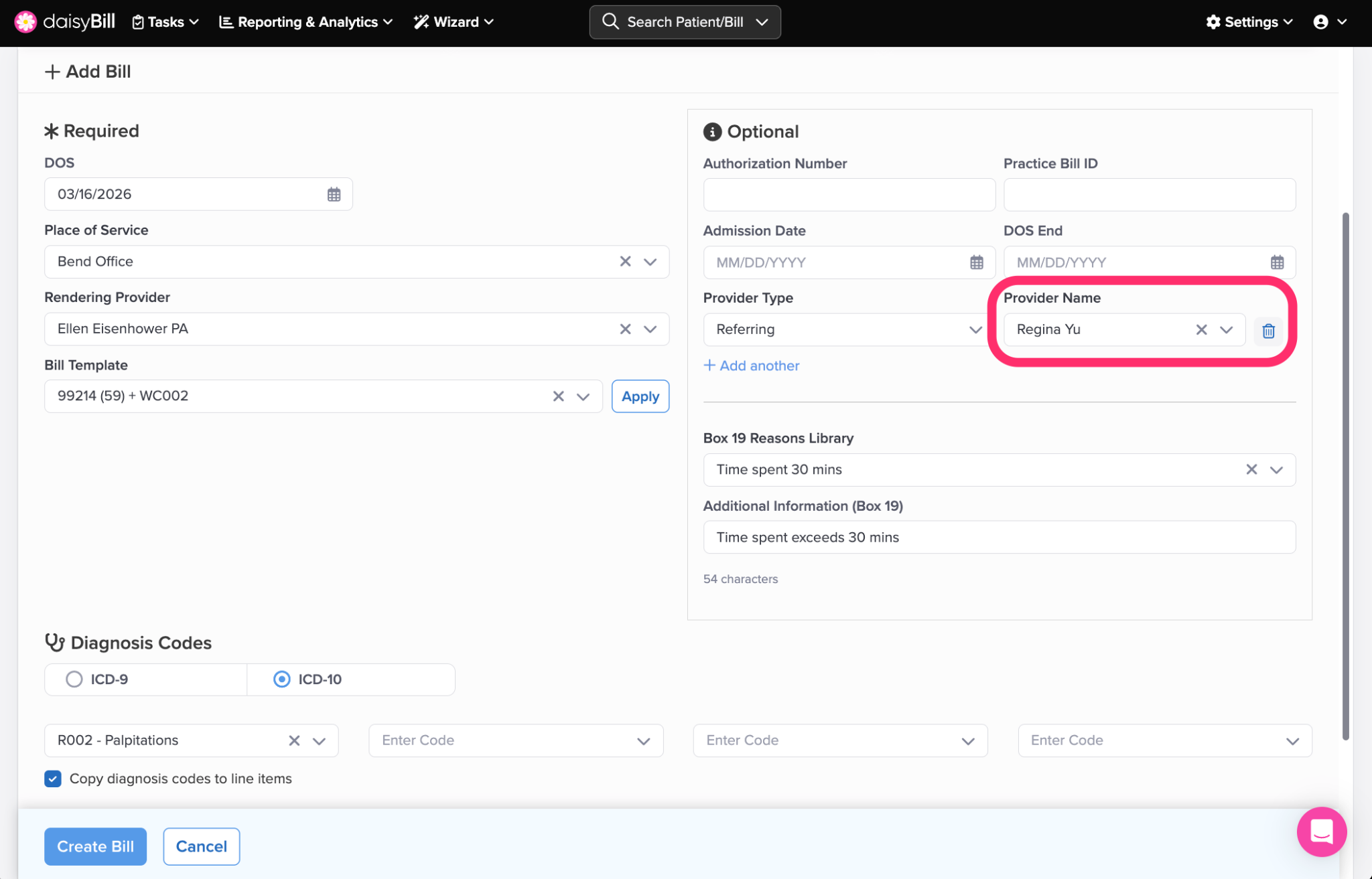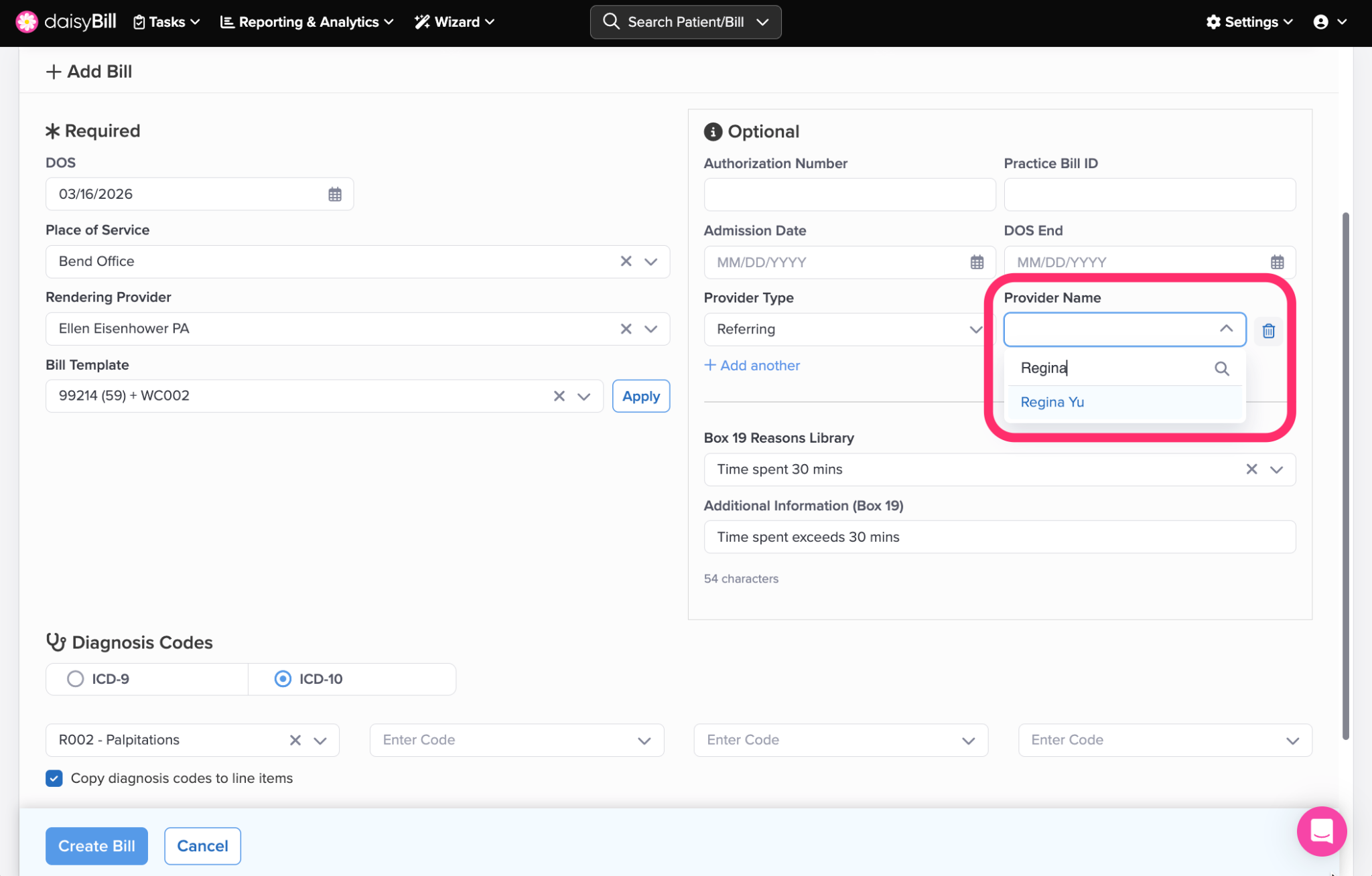 To add a Referring Provider or an Ordering Provider to a Bill, select the Provider Type in the Optional section.