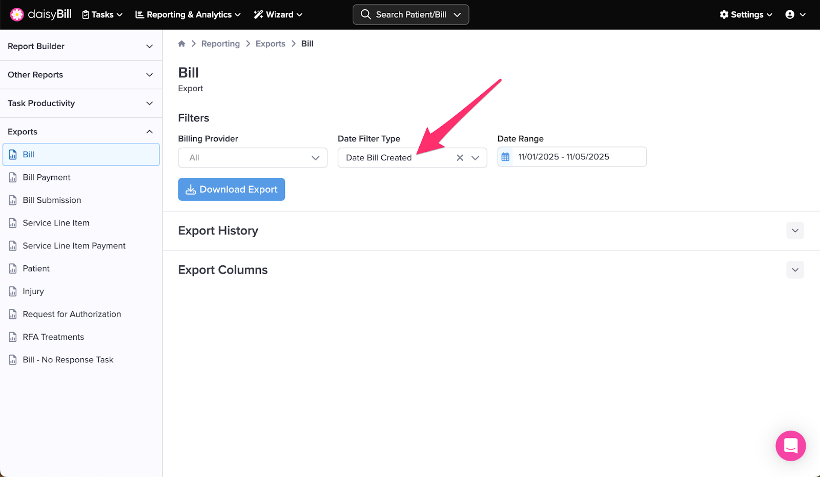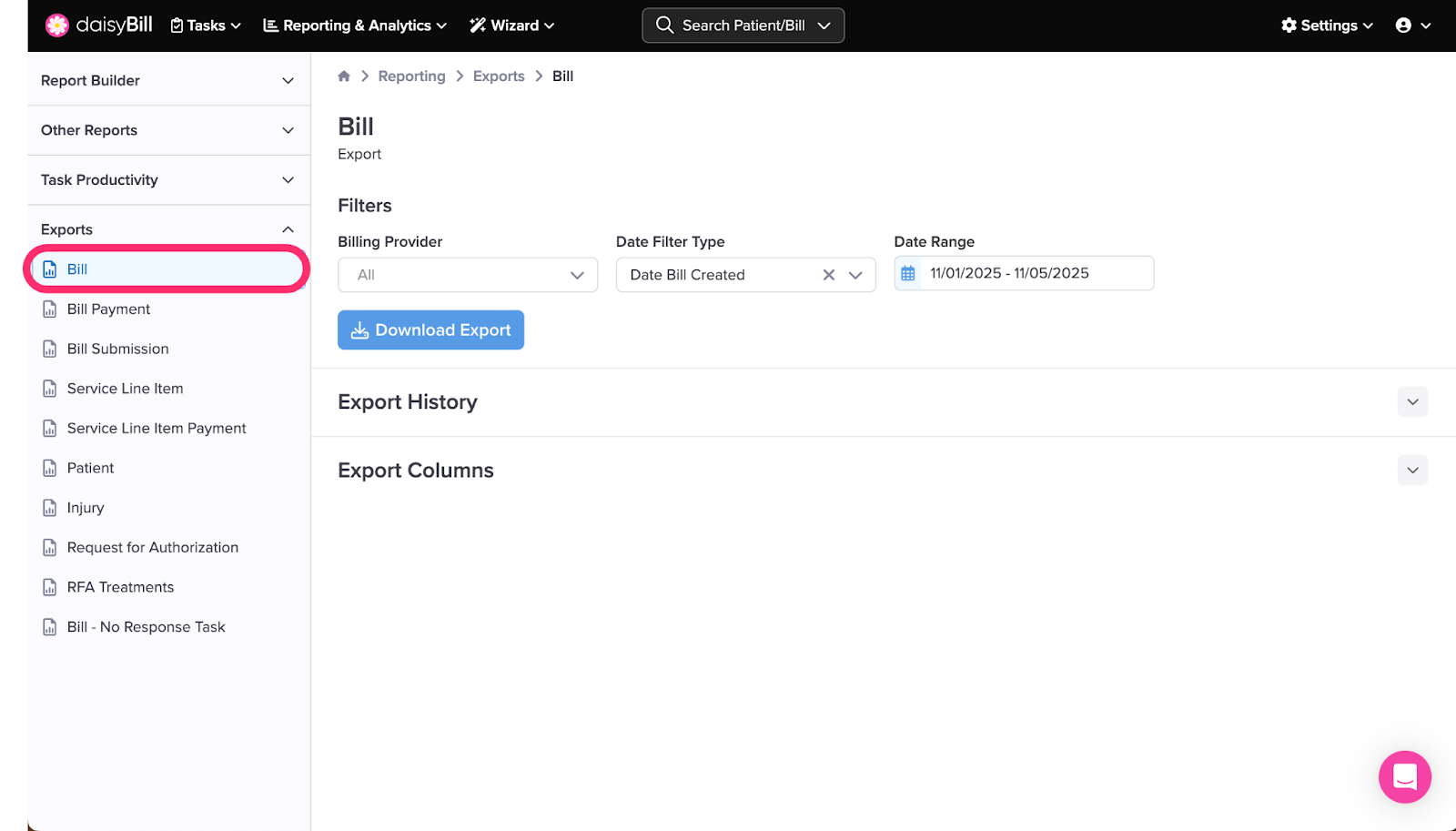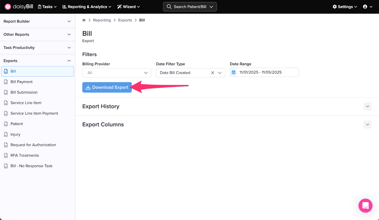 Step 8. To view a history of Bill Exports, click ‘Export History’