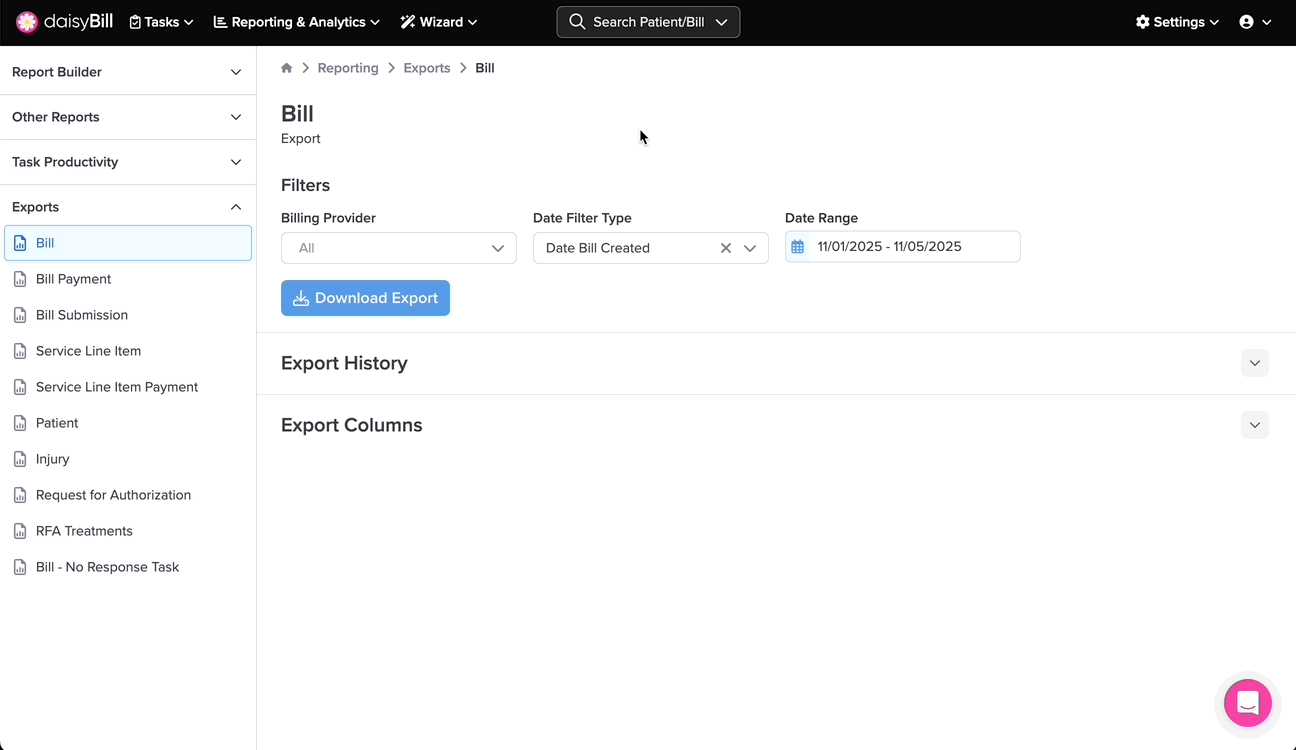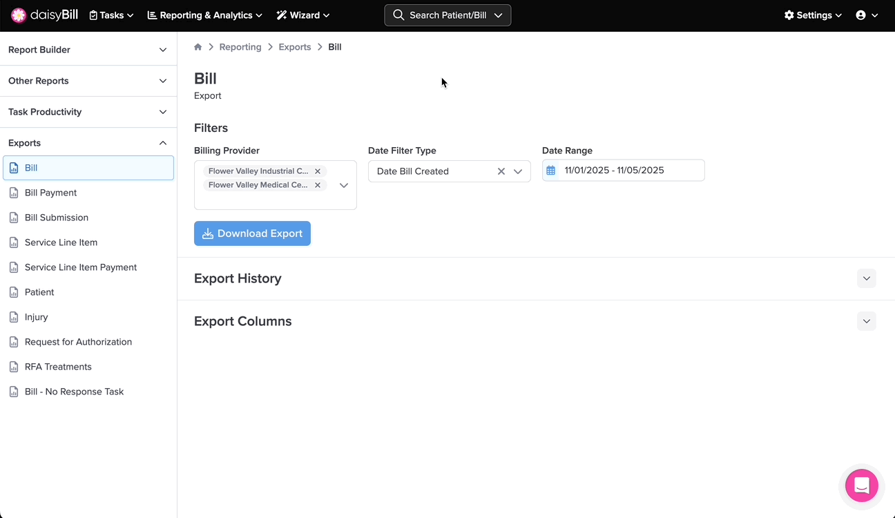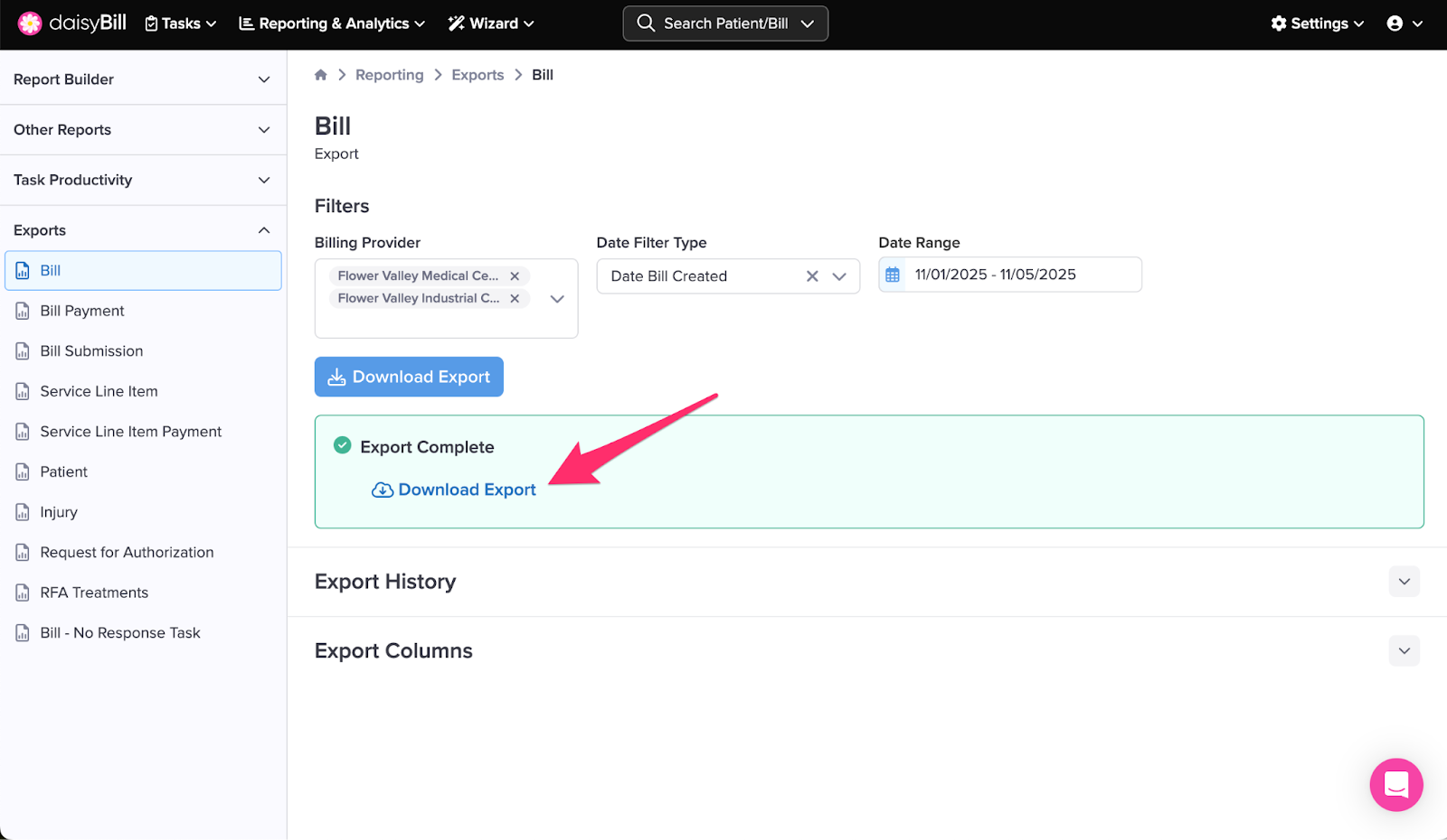 Step 8. To view a history of Bill Exports, click ‘Export History’