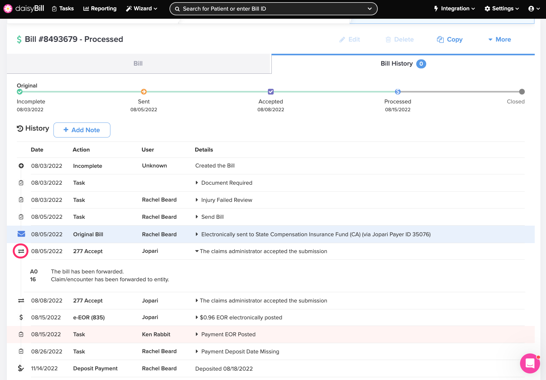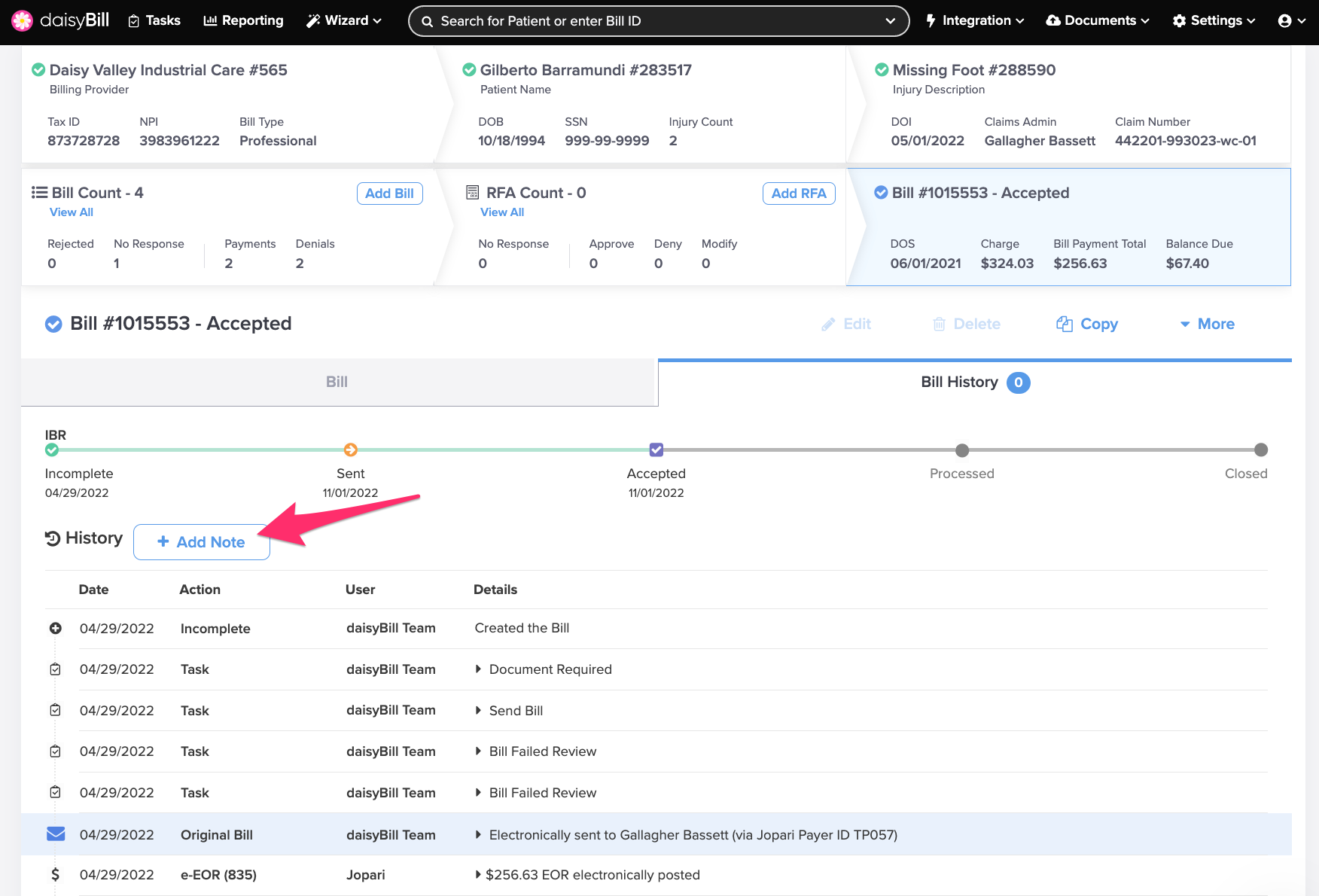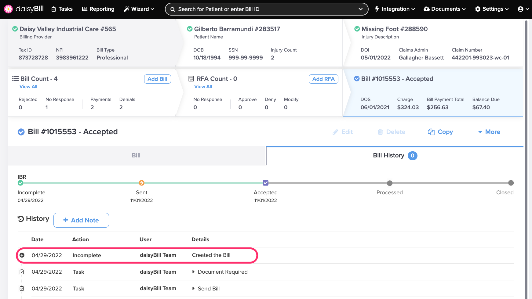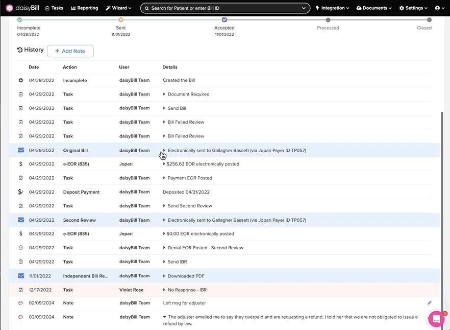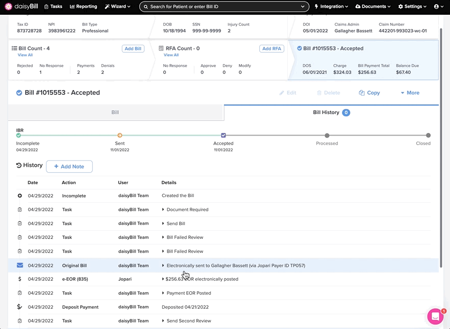 The Bill History tracks and displays a Bill's complete history, including submissions, reimbursements, Bill Tasks, and notes. It also serves as verifiable proof that the payer received the bill.