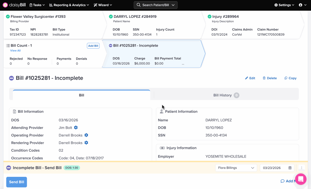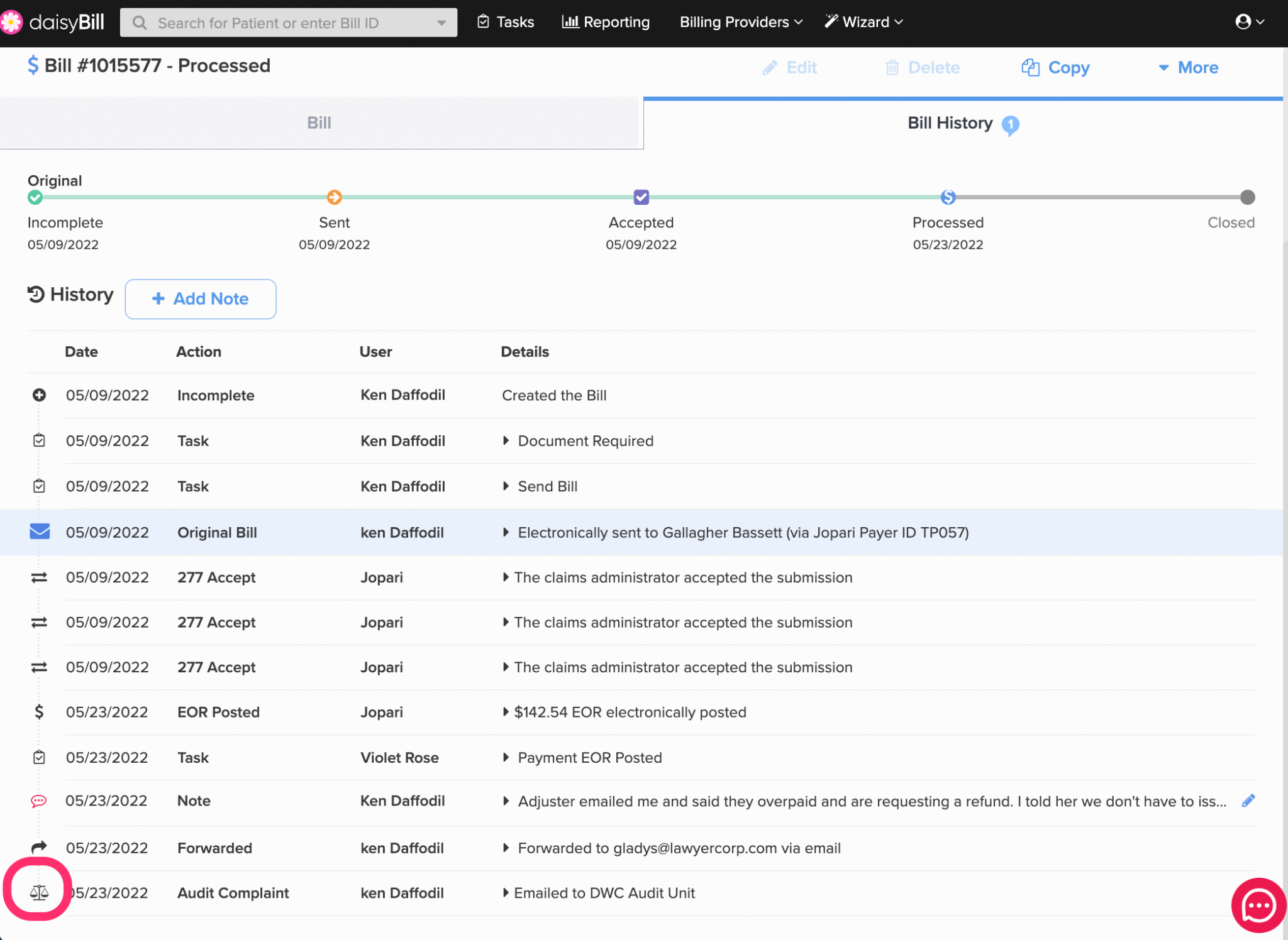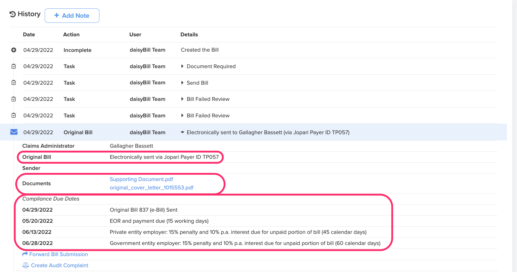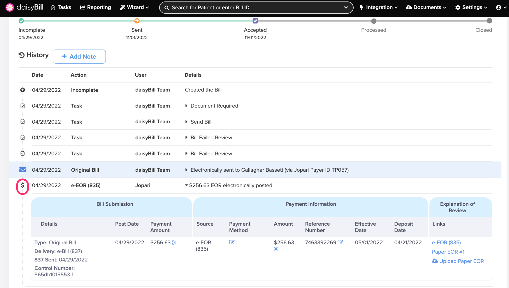 The Bill History tracks and displays a Bill's complete history, including submissions, reimbursements, Bill Tasks, and notes. It also serves as verifiable proof that the payer received the bill.