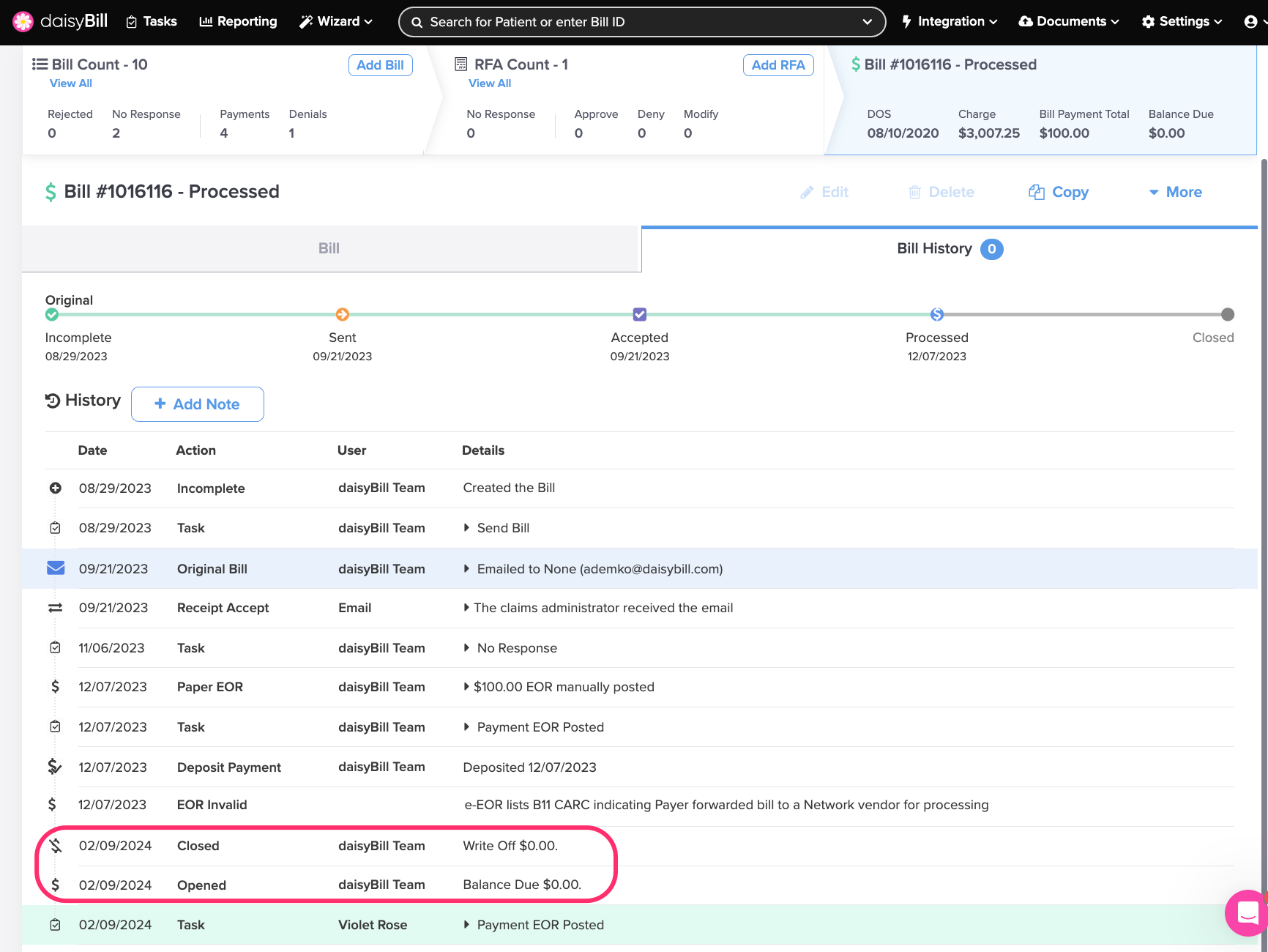 When a bill is marked Closed, daisyBill displays the Write Off amount and the Write Off Reason (if available).