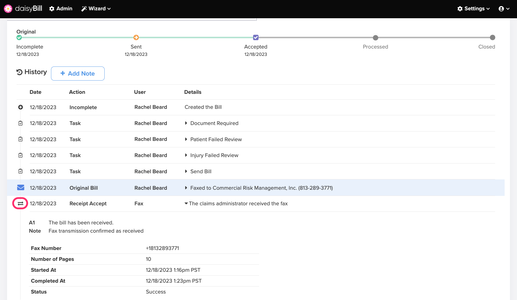 Click the ‘Parallel Arrows’ icon to view and track faxed Bill receipt status. daisyBill retains all fax receipts for Bills submitted via fax.