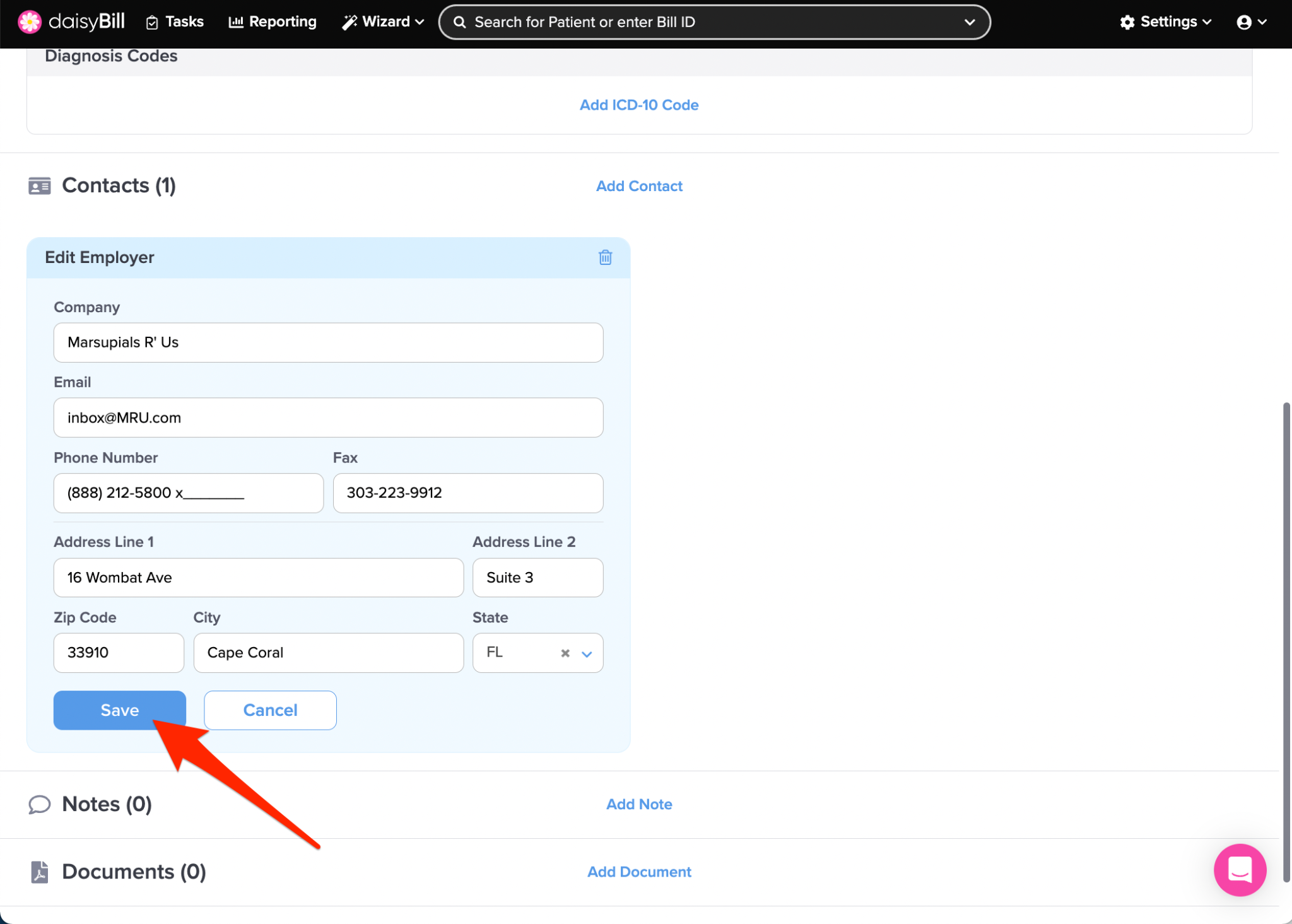 Add all available contact information for the bill recipient in the Injury Contact section, including the mailing address.
