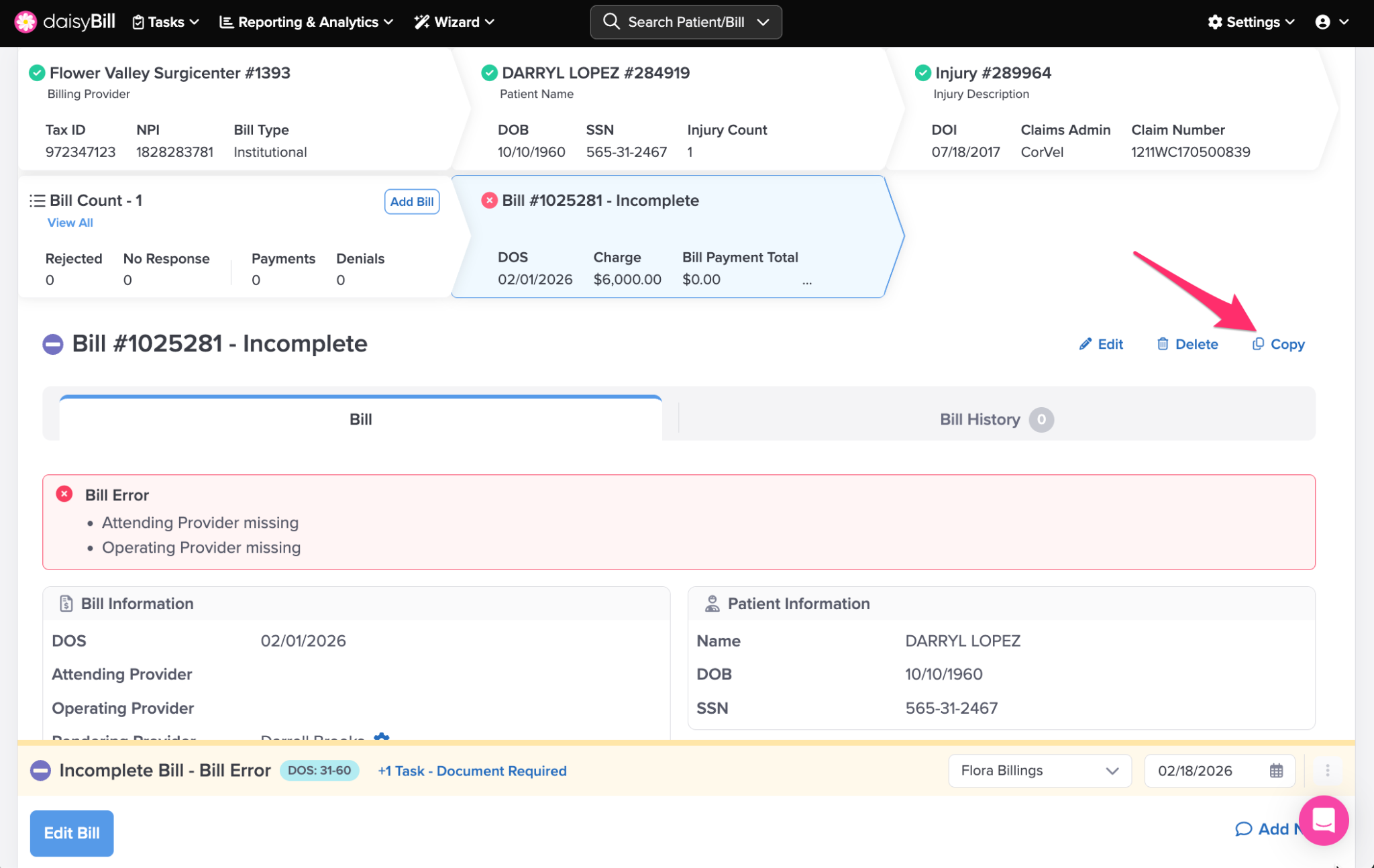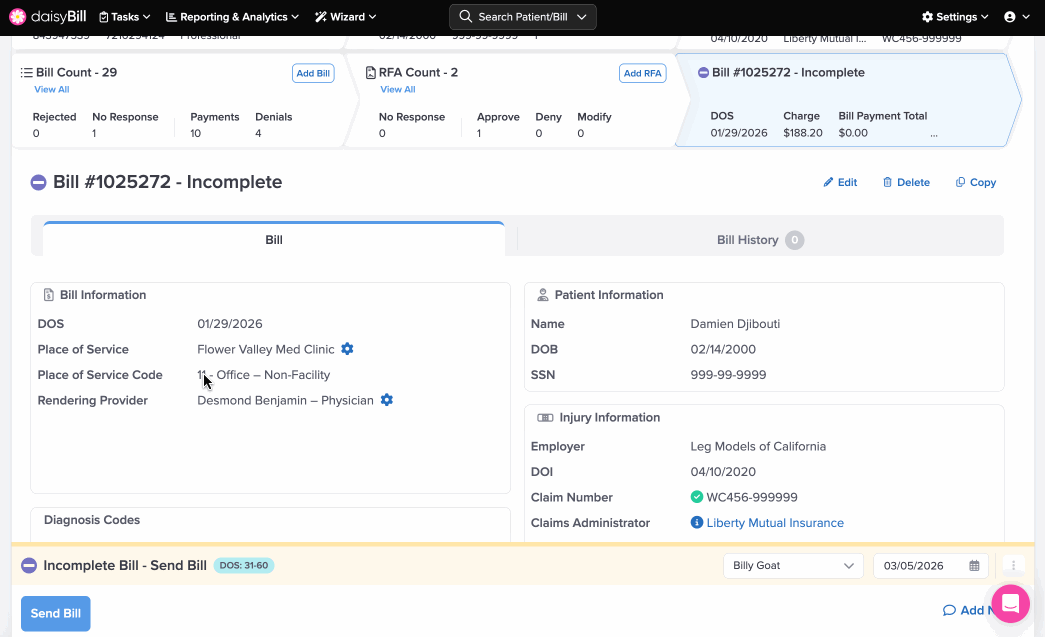 Click the ‘Bill Count’ Breadcrumb to view a full list of bills entered for the patient’s Injury. For more information, see the Help Article: Bill List Explained.