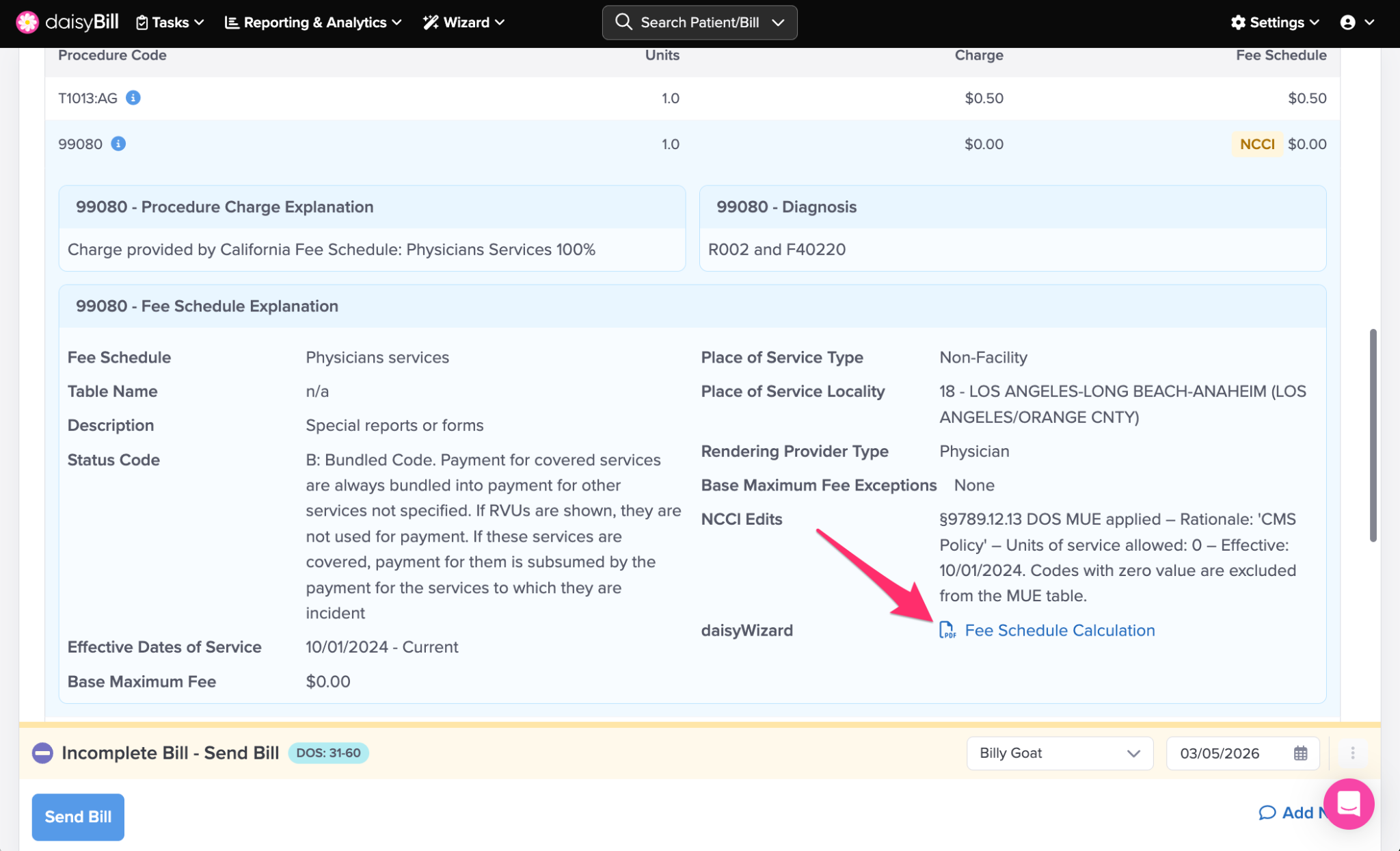 Click the ‘i’ icon next to a Procedure Code to review details, such as where the ‘Charge’ and ‘Expected Fee Schedule’ populate from (e.g., Practice Charge, By Report Code, or AG Modifier). When applicable, daisyBill displays any Billing Ground Rules or NCCI Edits.