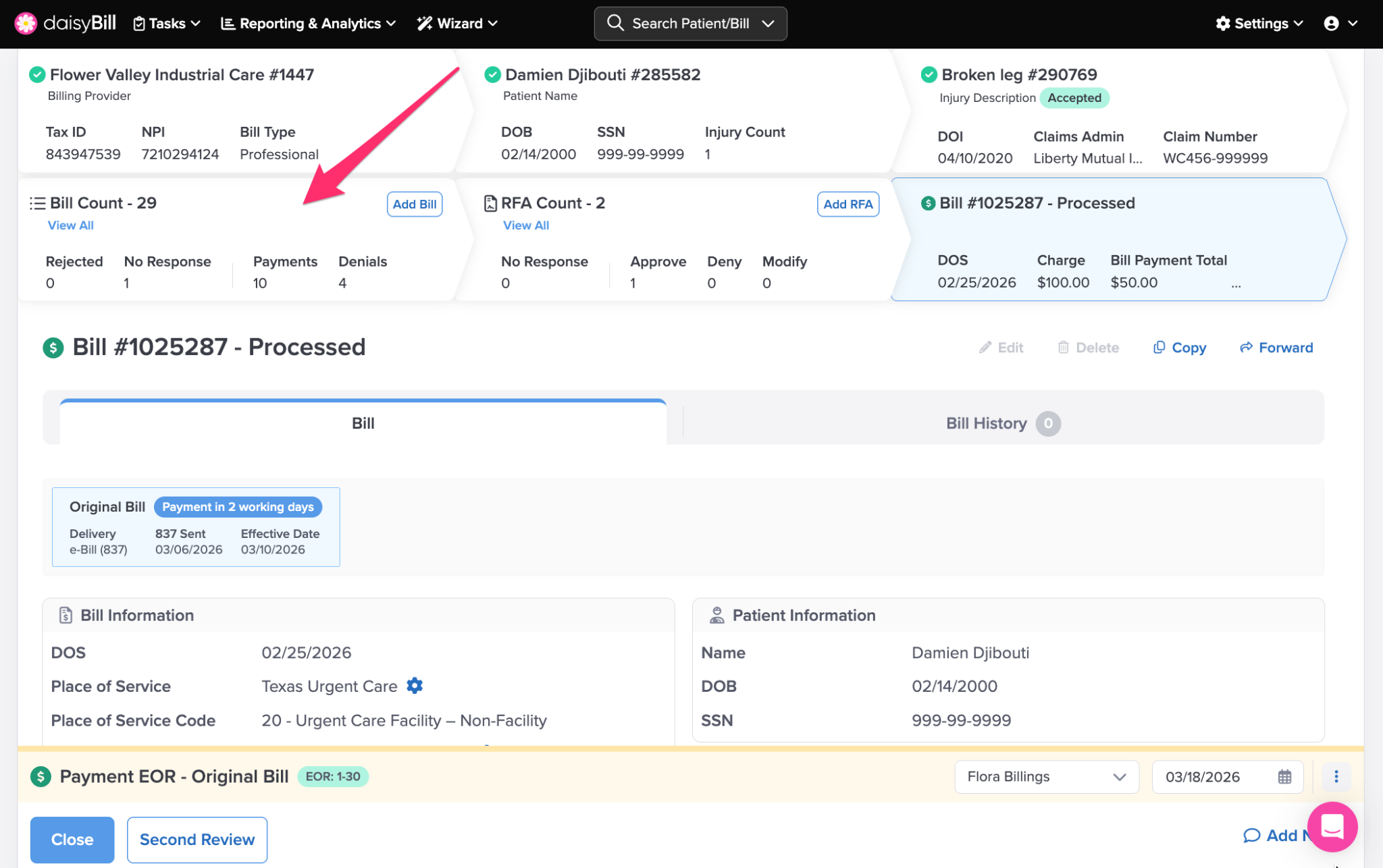The Bill Count breadcrumb displays the count of Bills submitted for the patient’s Injury, and includes the count of: