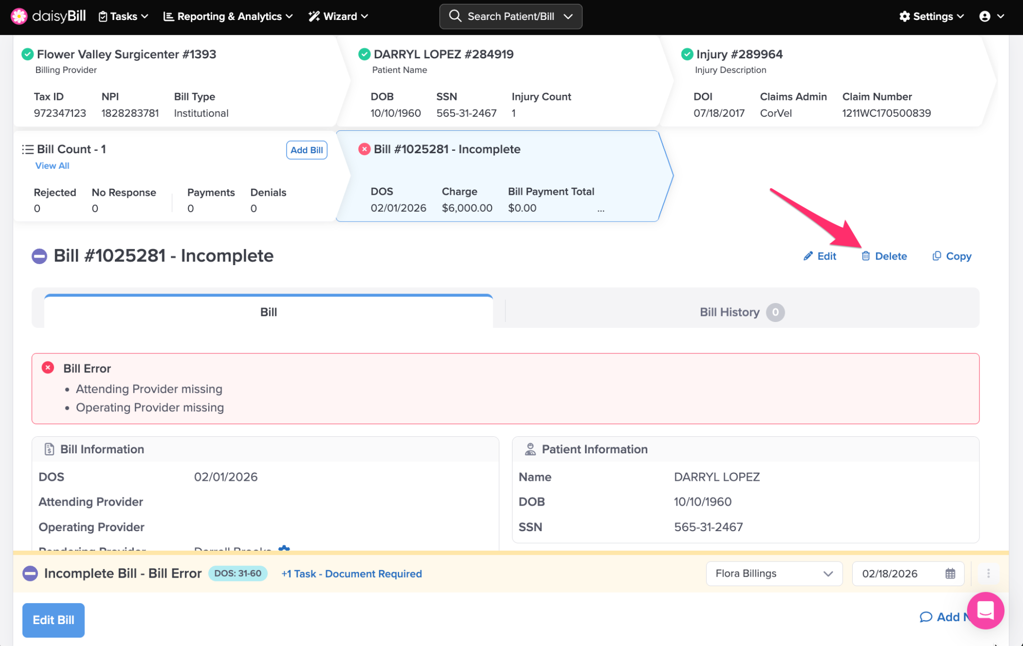 Edit Original Bills with an Incomplete or Rejected Status. Note that once the Bill is sent, it cannot be modified, deleted, or rescinded. For more information, see the Help Article: Edit Bill.