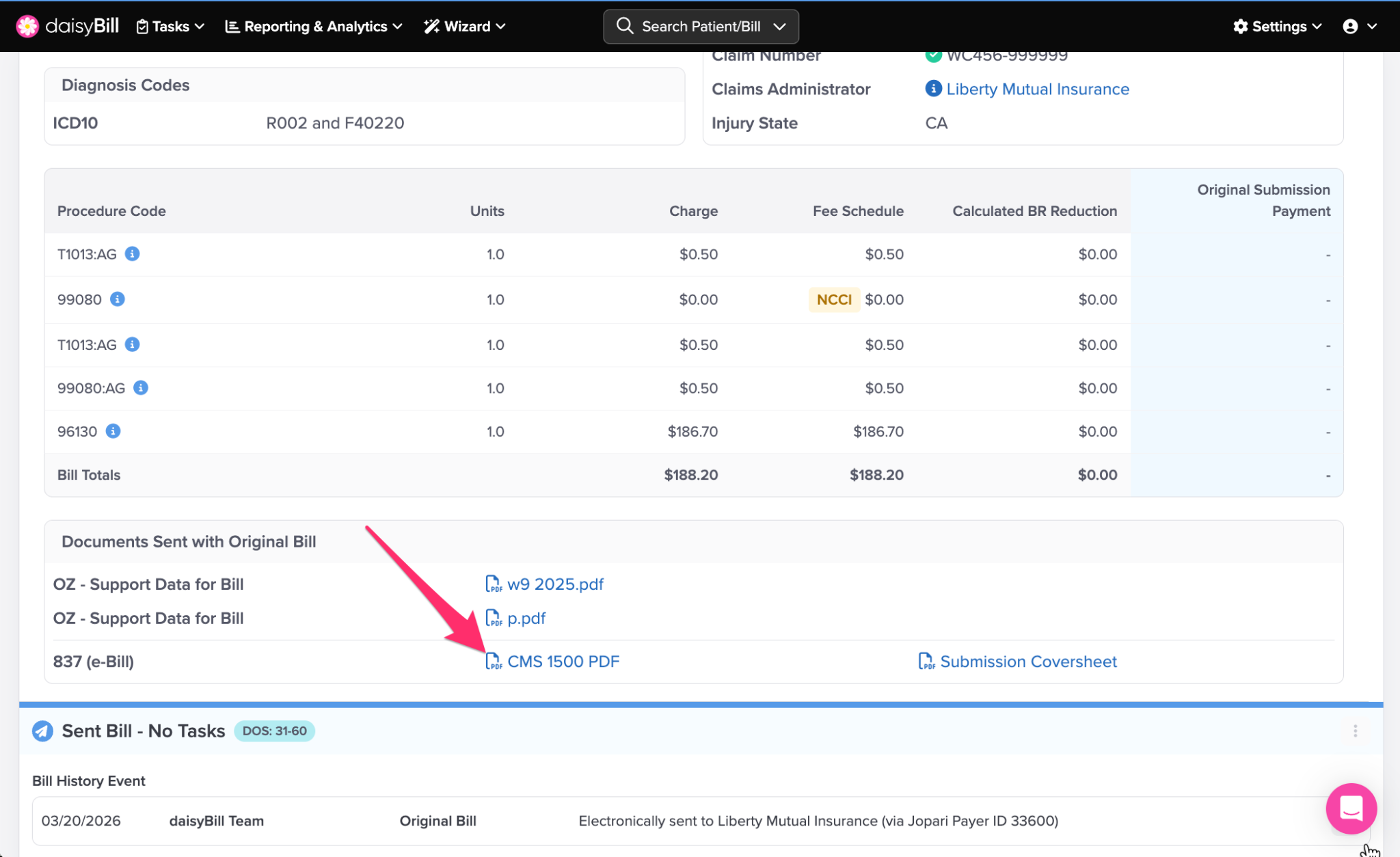 daisyBill allows you to view the CMS 1500 PDF once a Bill has a Sent Status. To view the CMS 1500, click ‘CMS 1500 PDF’. For more information, see the Help Article: View CMS 1500.