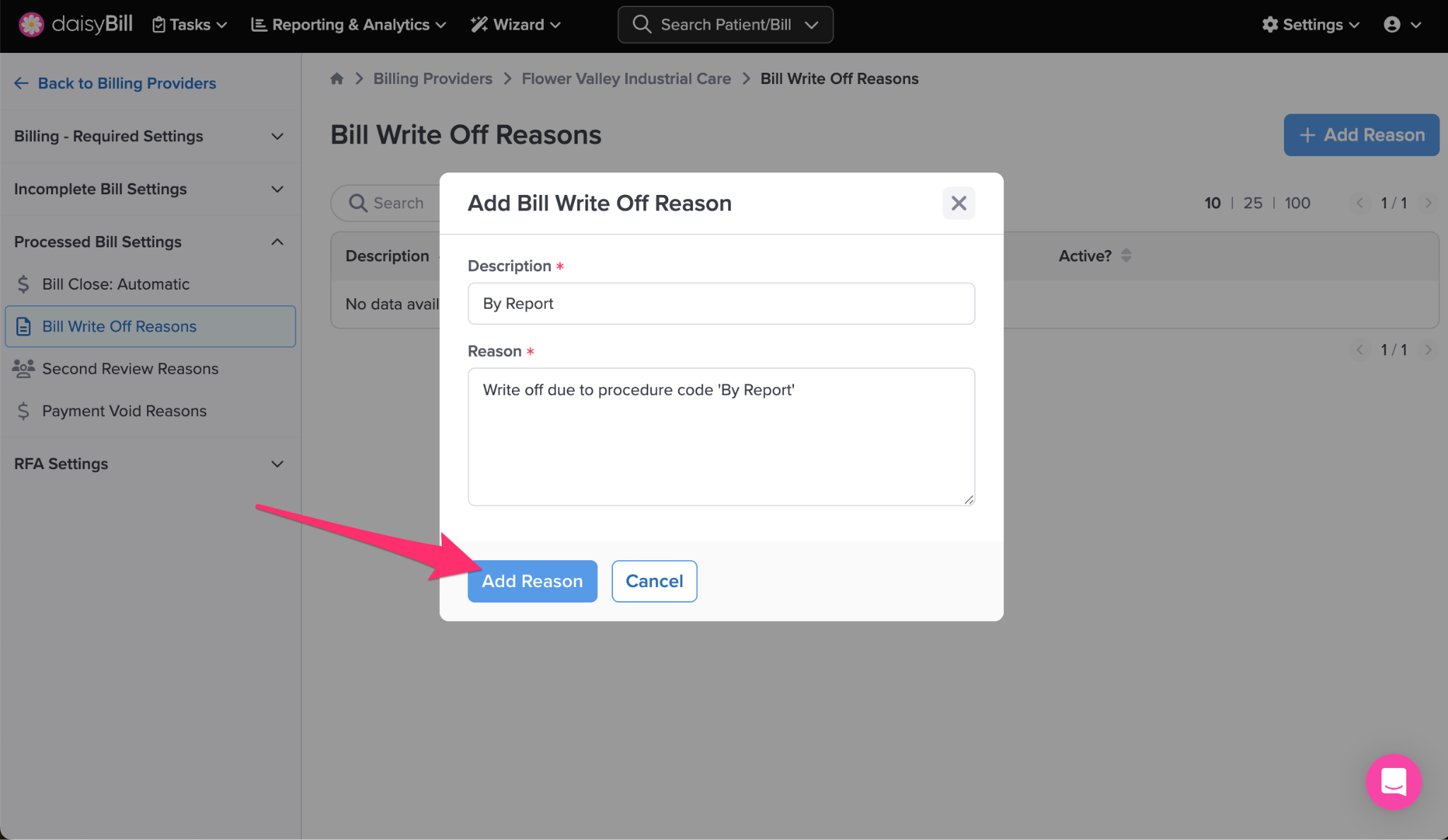 Step 3. To add a new ‘Bill Write Off Reason,’ click the ‘Add Reason’ button