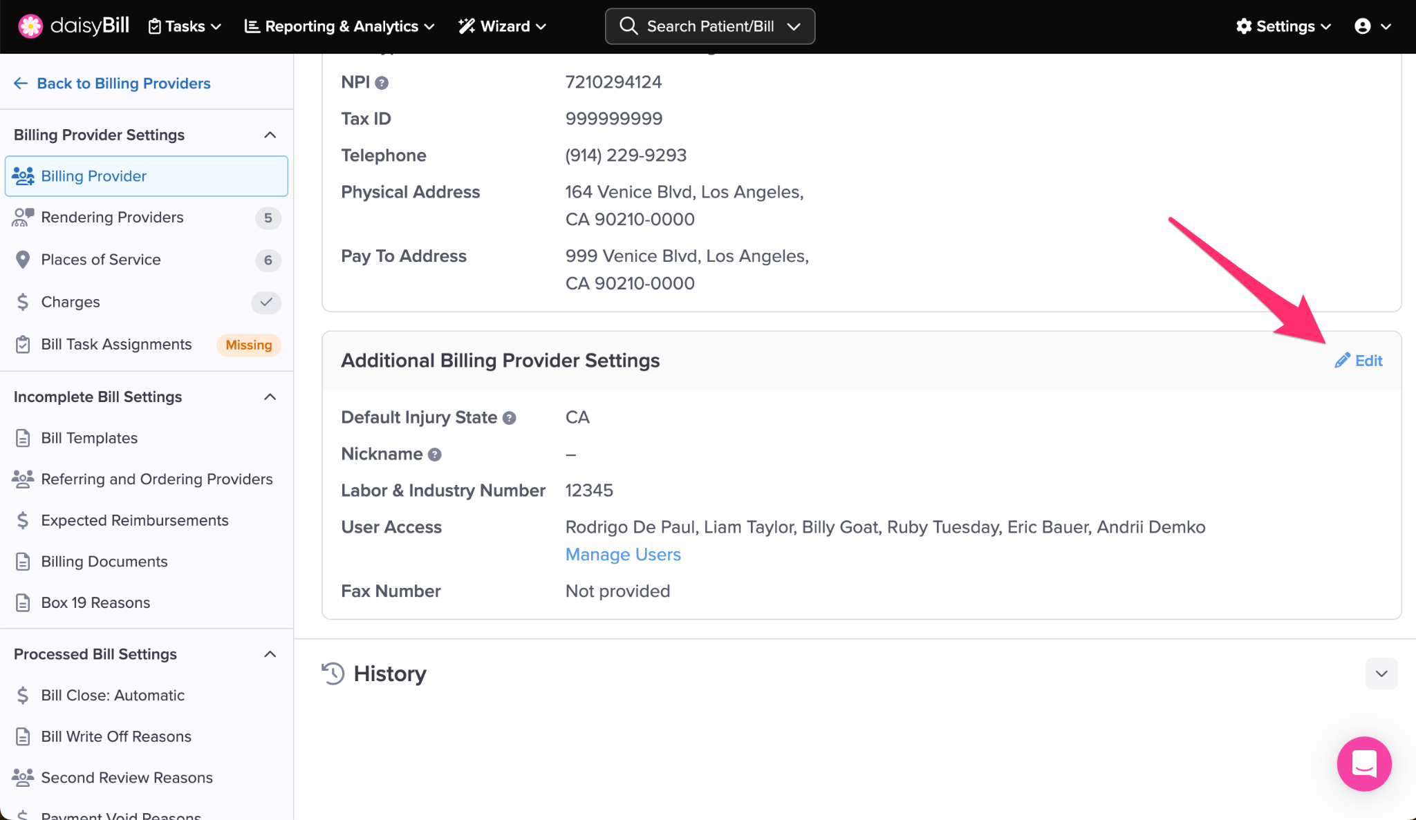 Step 3. To edit Additional Billing Provider Settings, click ‘Edit’