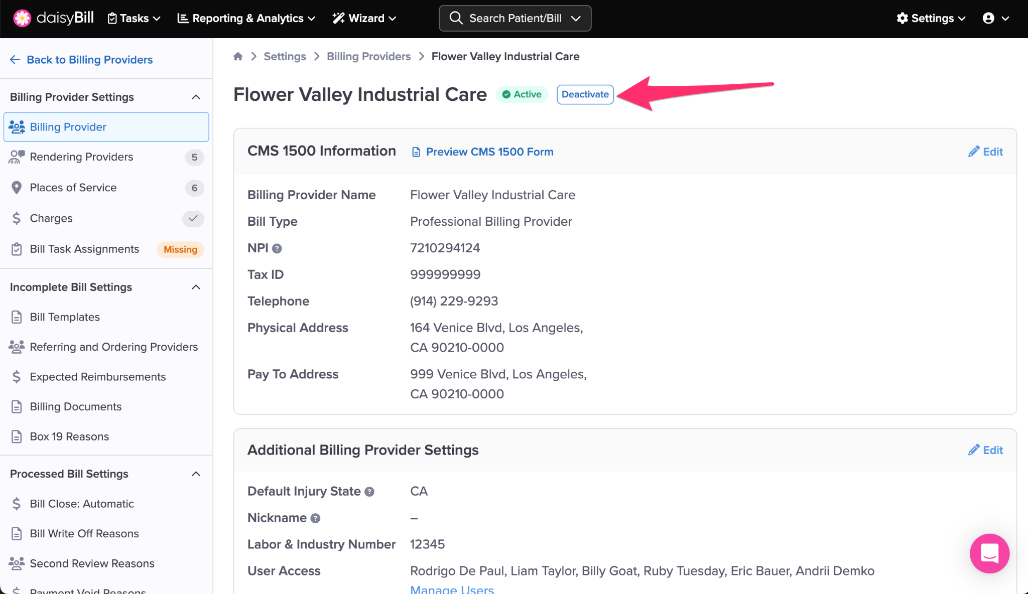 To deactivate a Billing Provider and prevent it from displaying in your Billing Provider Menu, click ‘Deactivate’