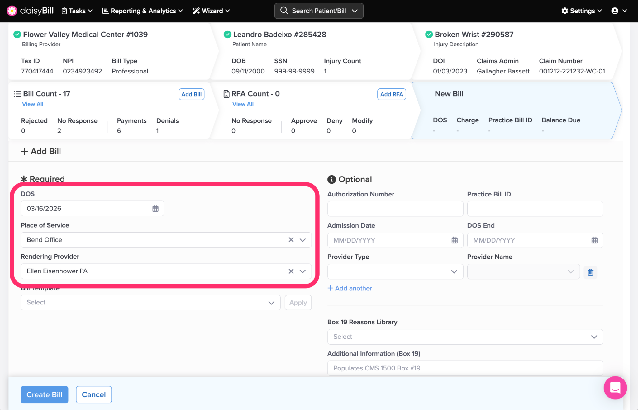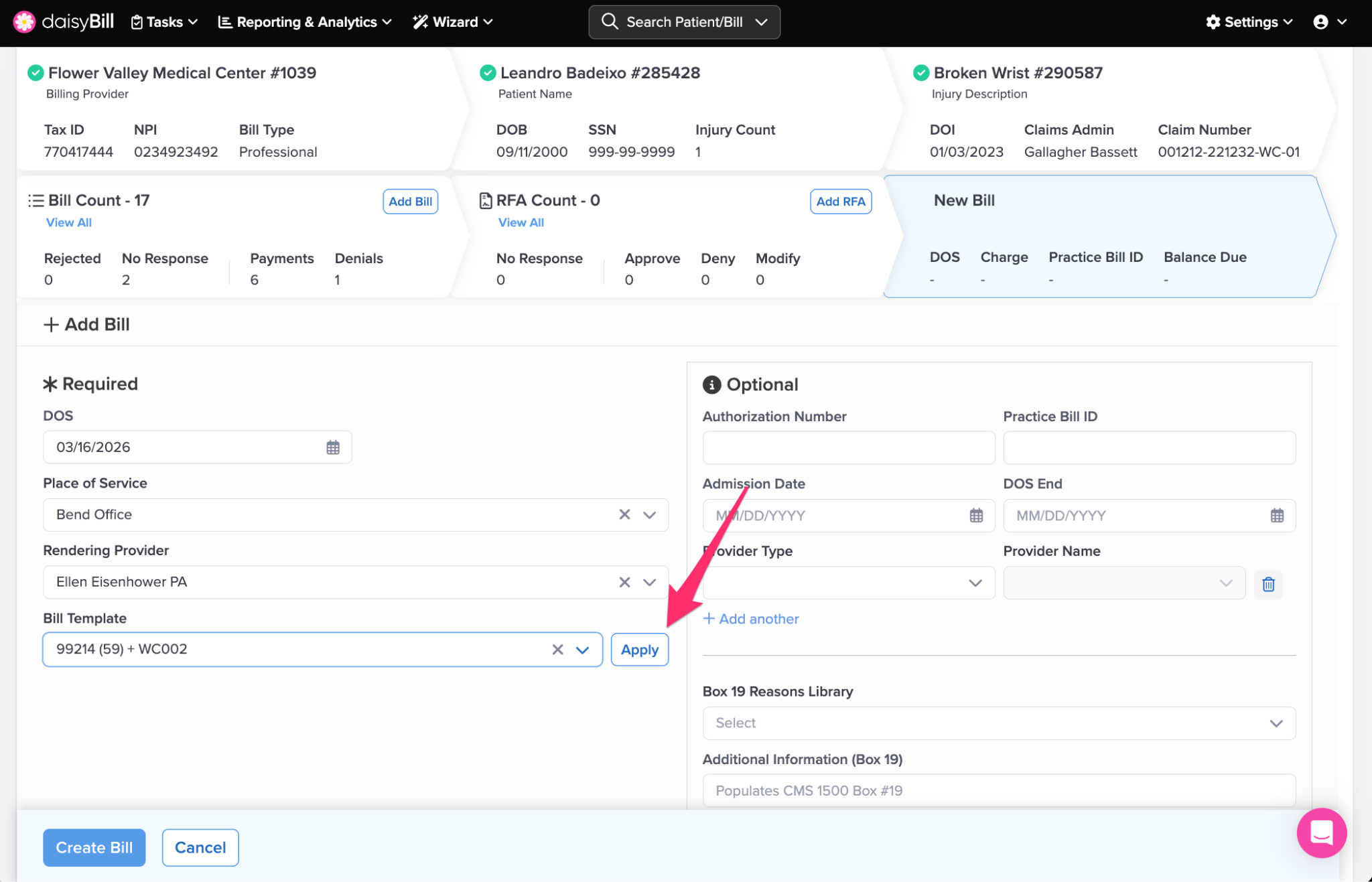 Step 1. From the patient’s Injury Page, click ‘Add Bill’