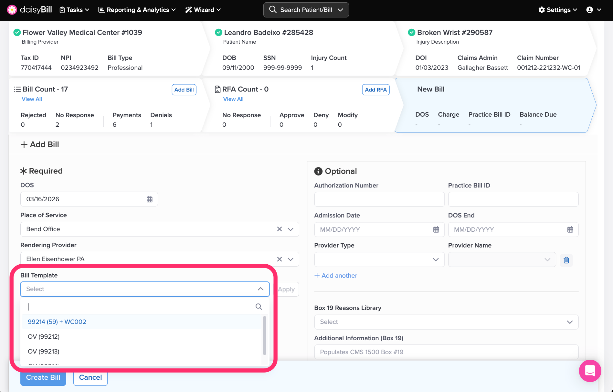 The Bill Template dropdown only appears if your practice has created one or more templates.