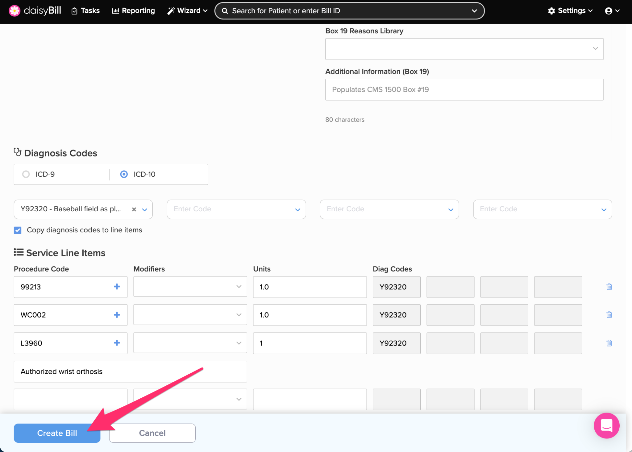 After the Billing Template populates the Bill, make any necessary edits and enter any additional Procedure Codes as needed.