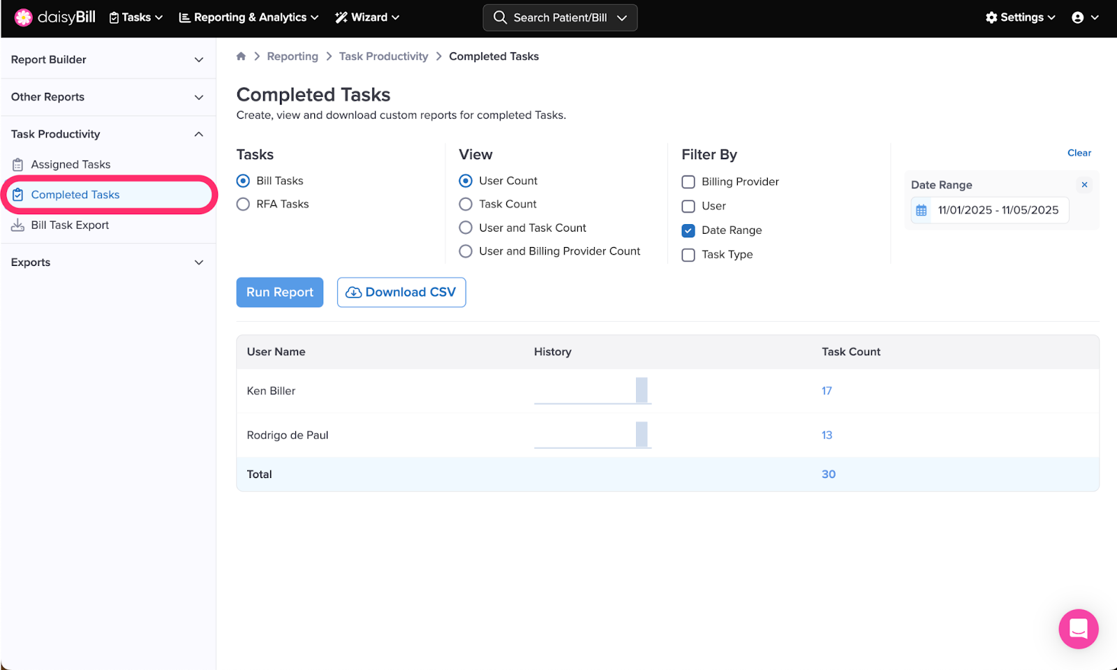 Select User and Billing Provider Count (when multiple Billing Providers exist) to view the count of completed tasks by User Name and Billing Provider.