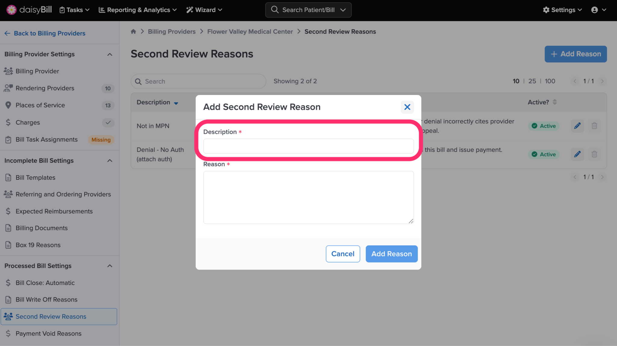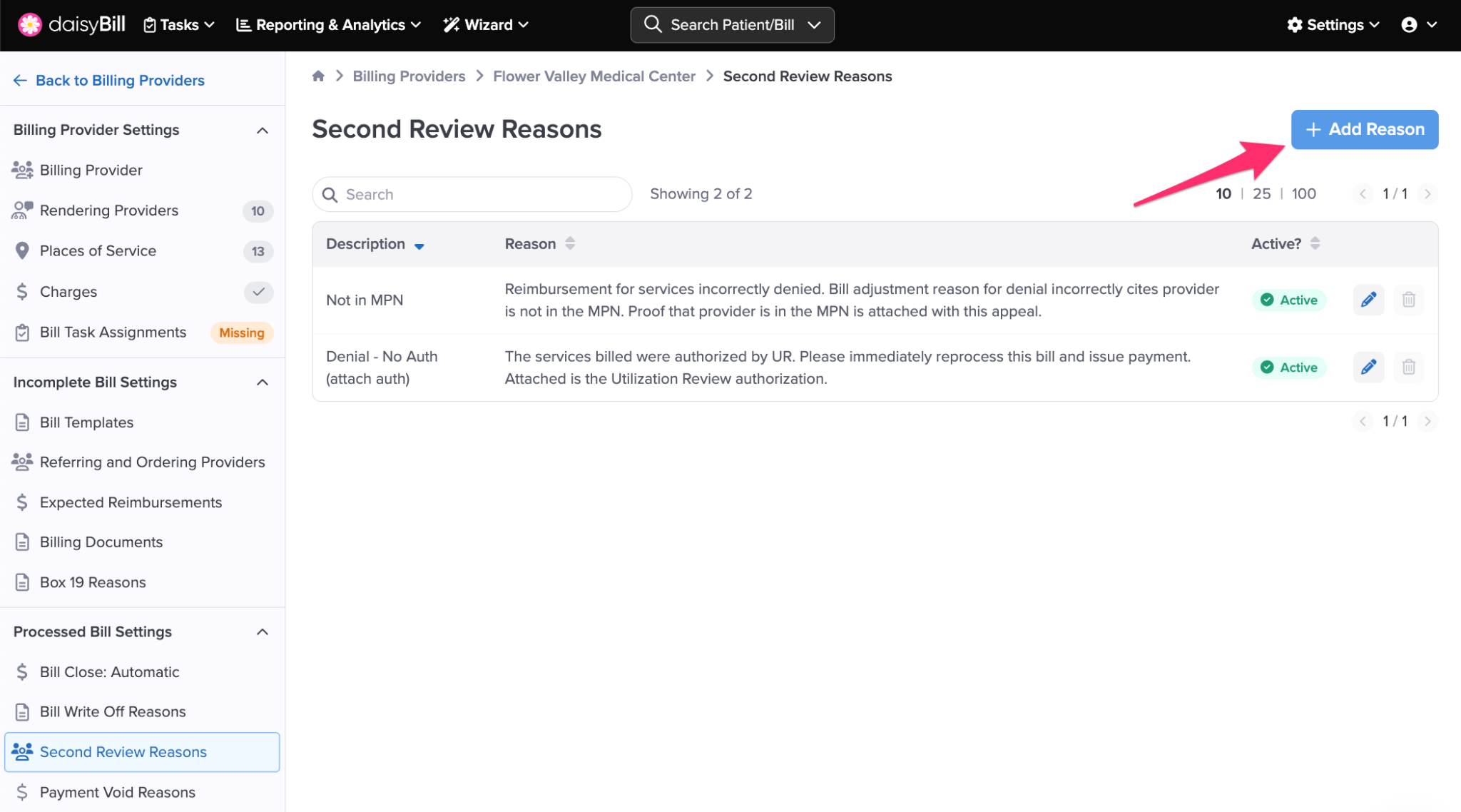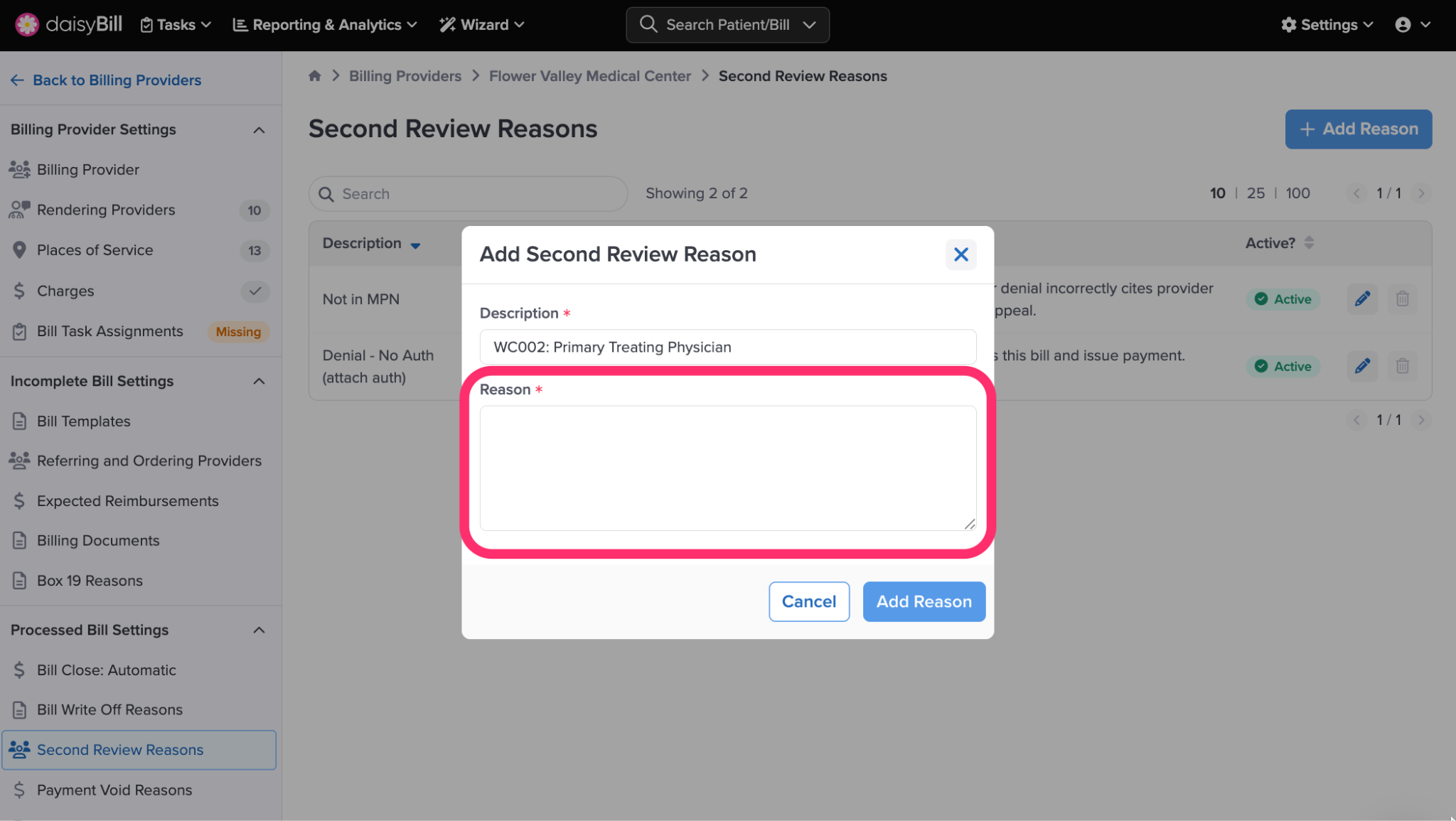 Only daisyBill Users with an Administrator role can manage Second Review / Appeal Reasons. For accounts with multiple Billing Providers, daisyBill maintains separate Second Review / Appeal Reasons for each Billing Provider.