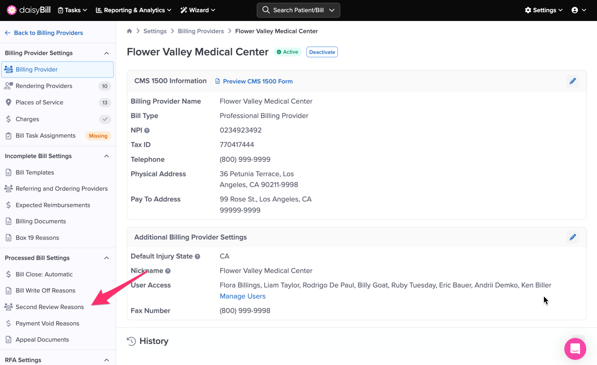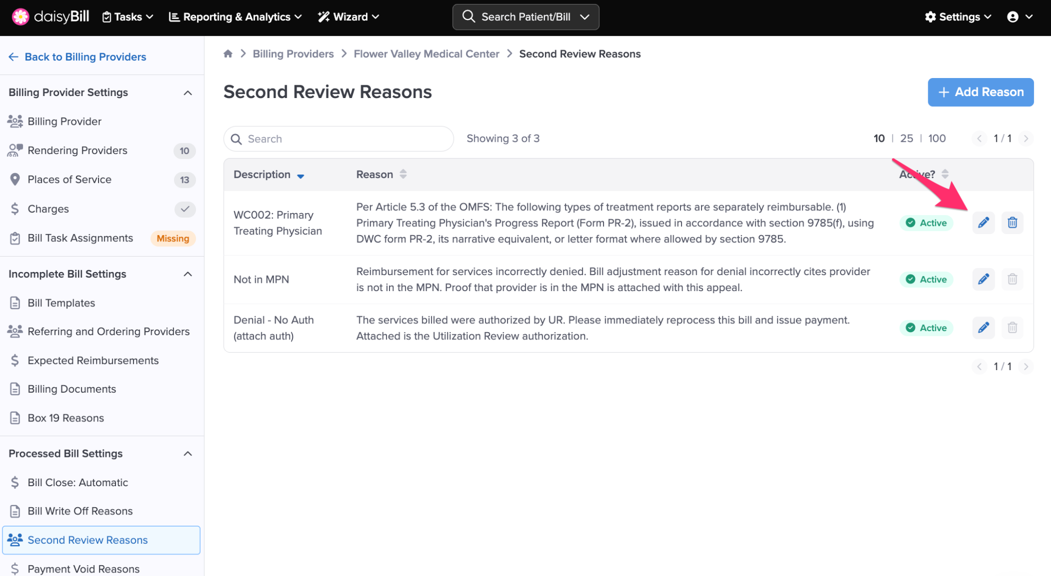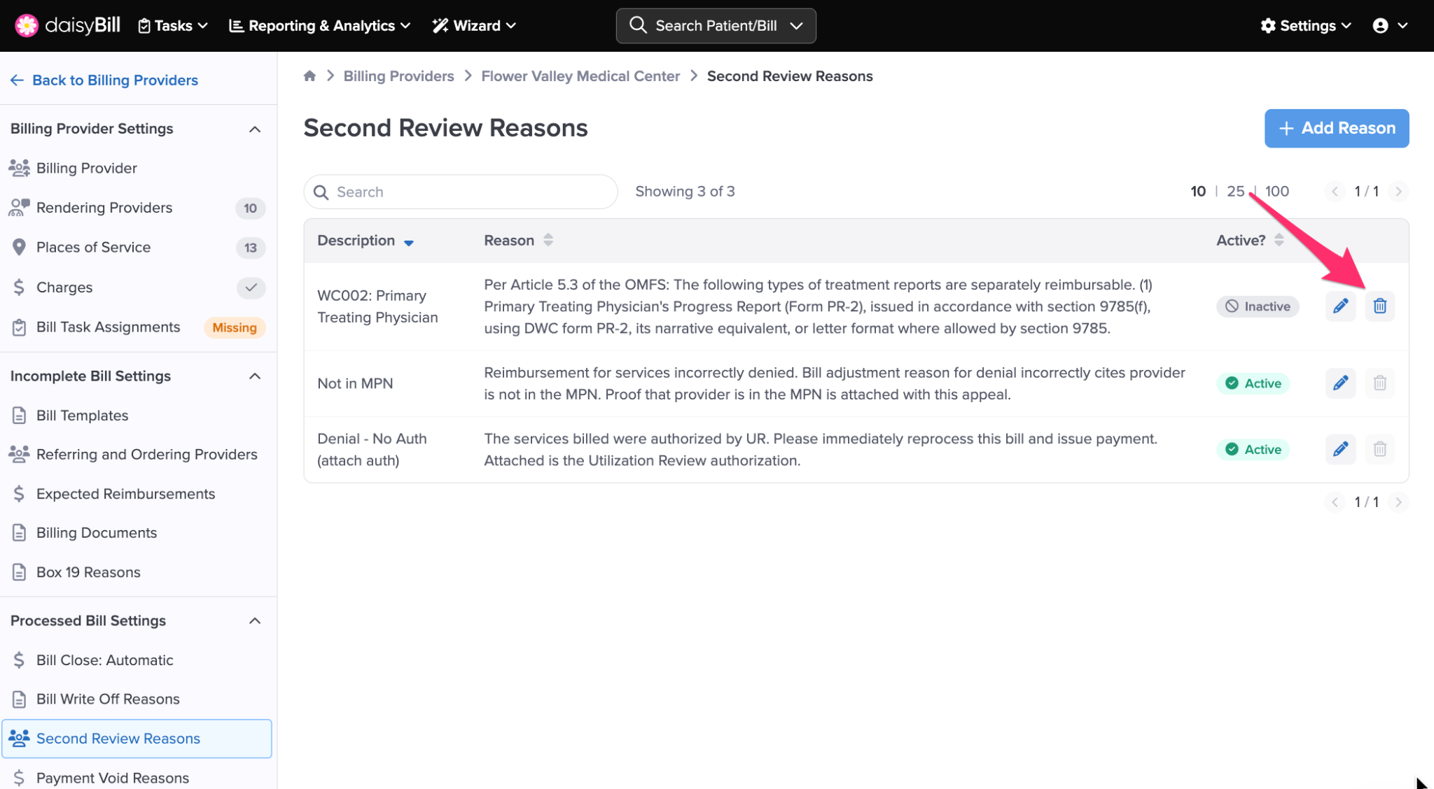 Only daisyBill Users with an Administrator role can manage Second Review / Appeal Reasons. For accounts with multiple Billing Providers, daisyBill maintains separate Second Review / Appeal Reasons for each Billing Provider.