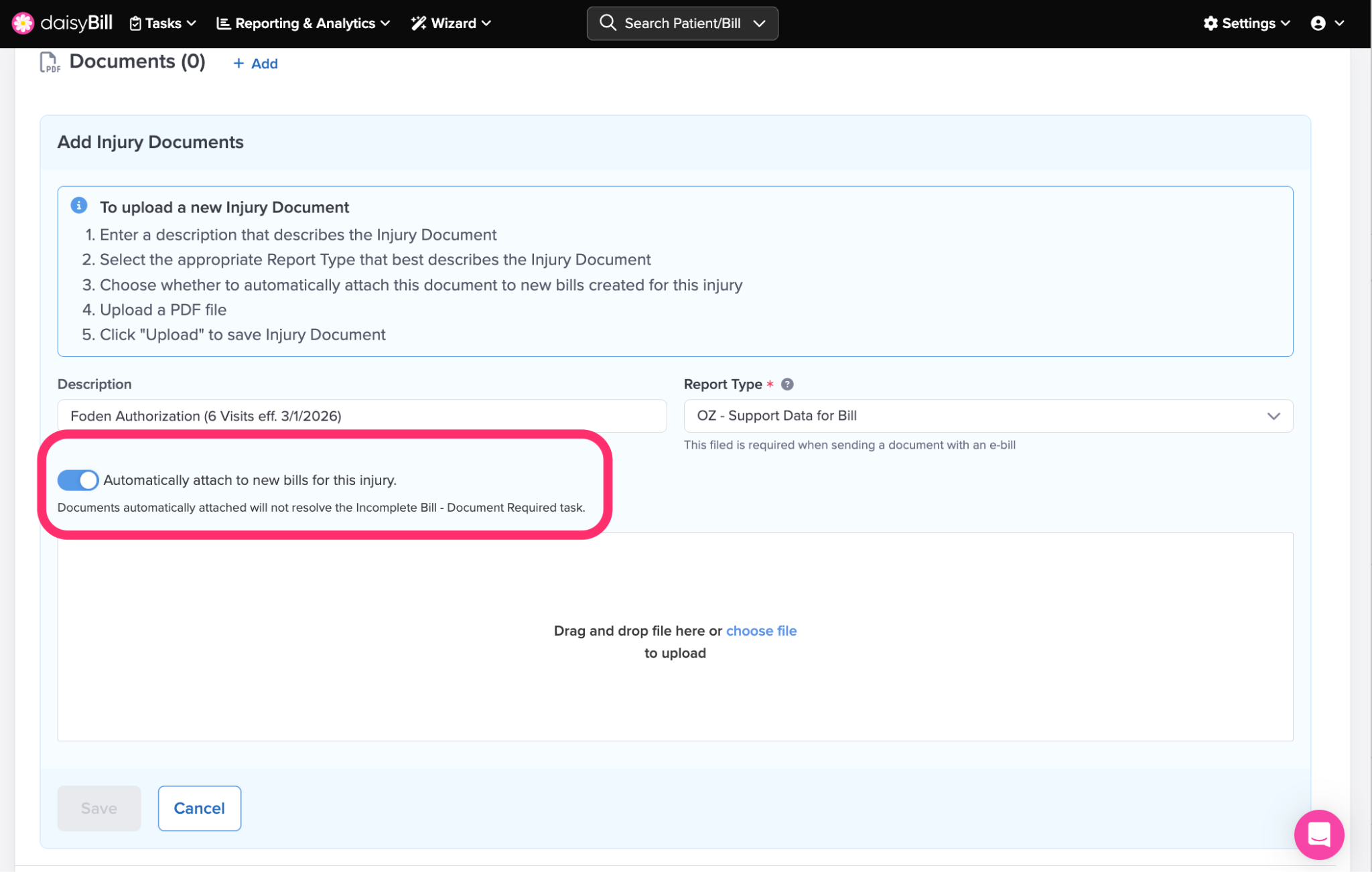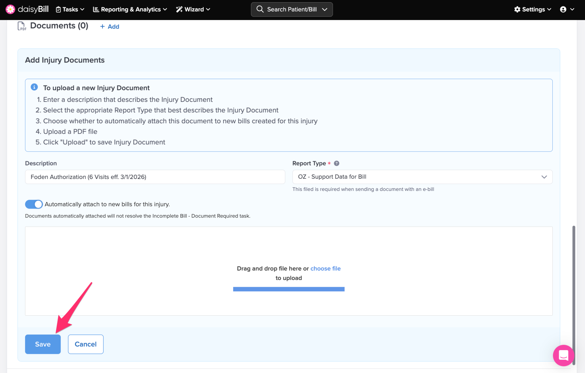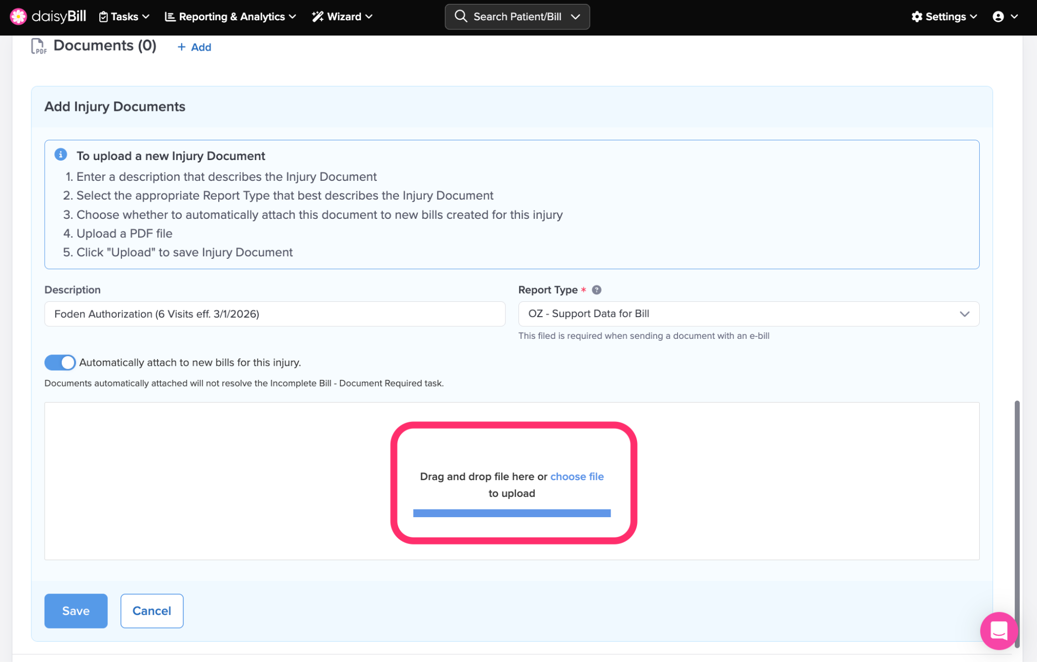 Once saved, your team can quickly attach these Injury Documents when entering a bill.