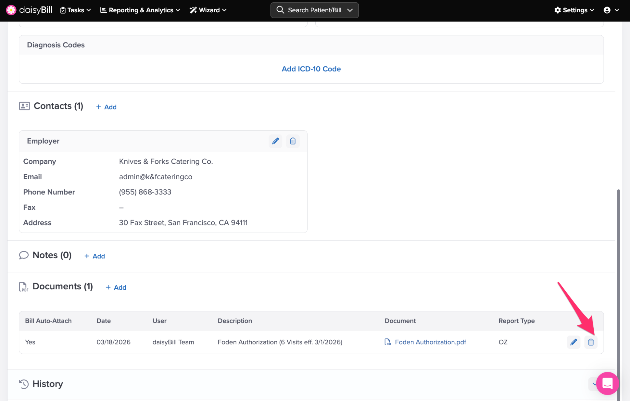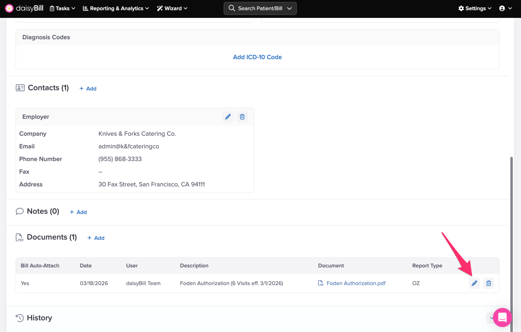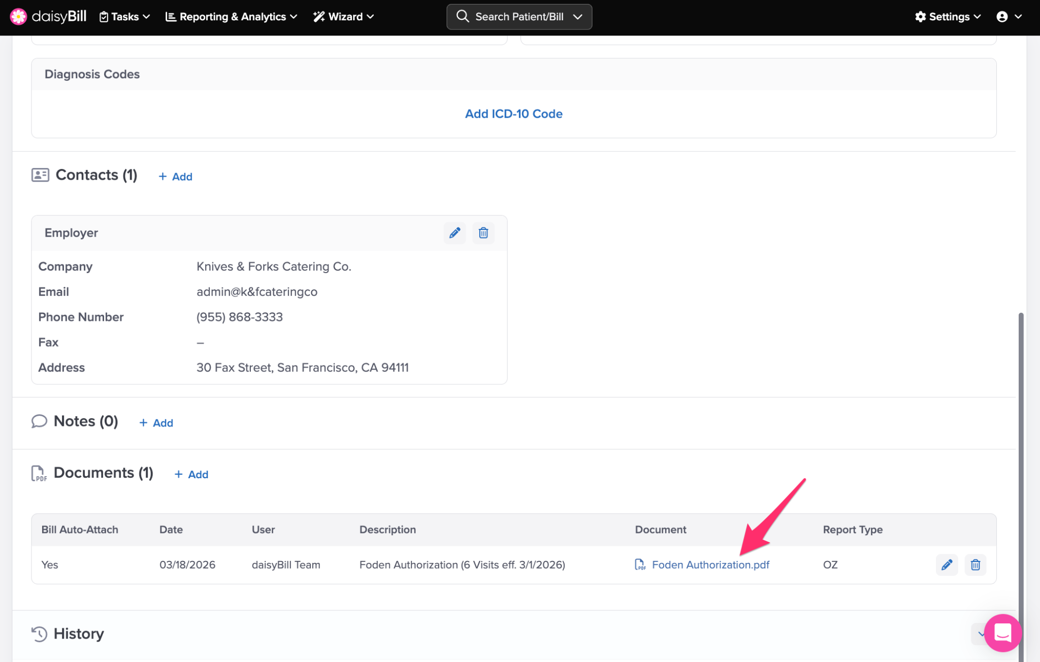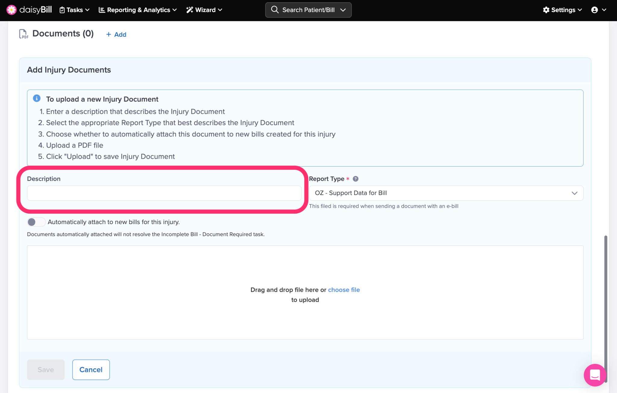 Once saved, your team can quickly attach these Injury Documents when entering a bill.