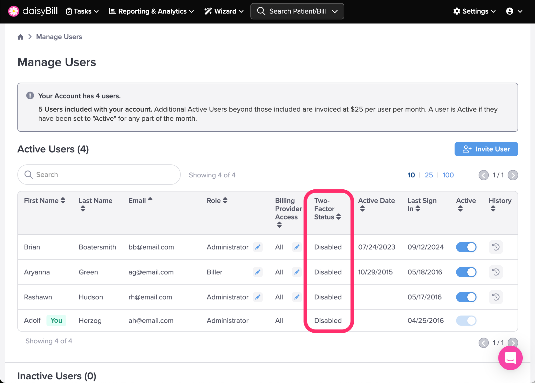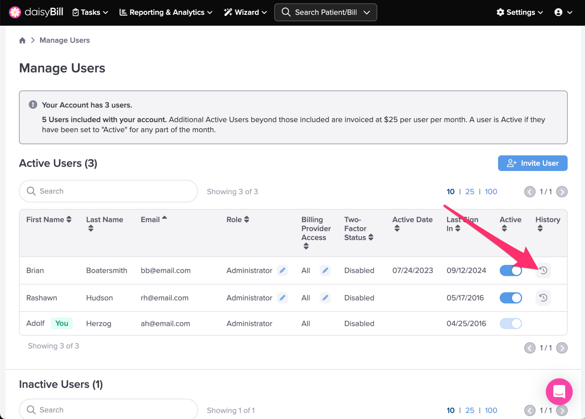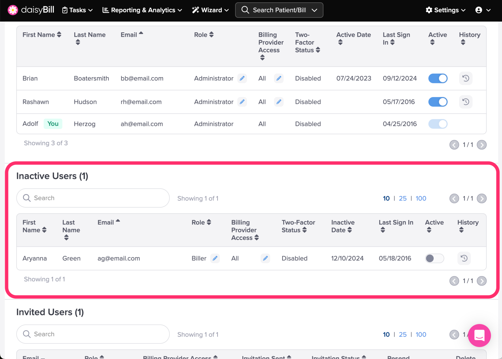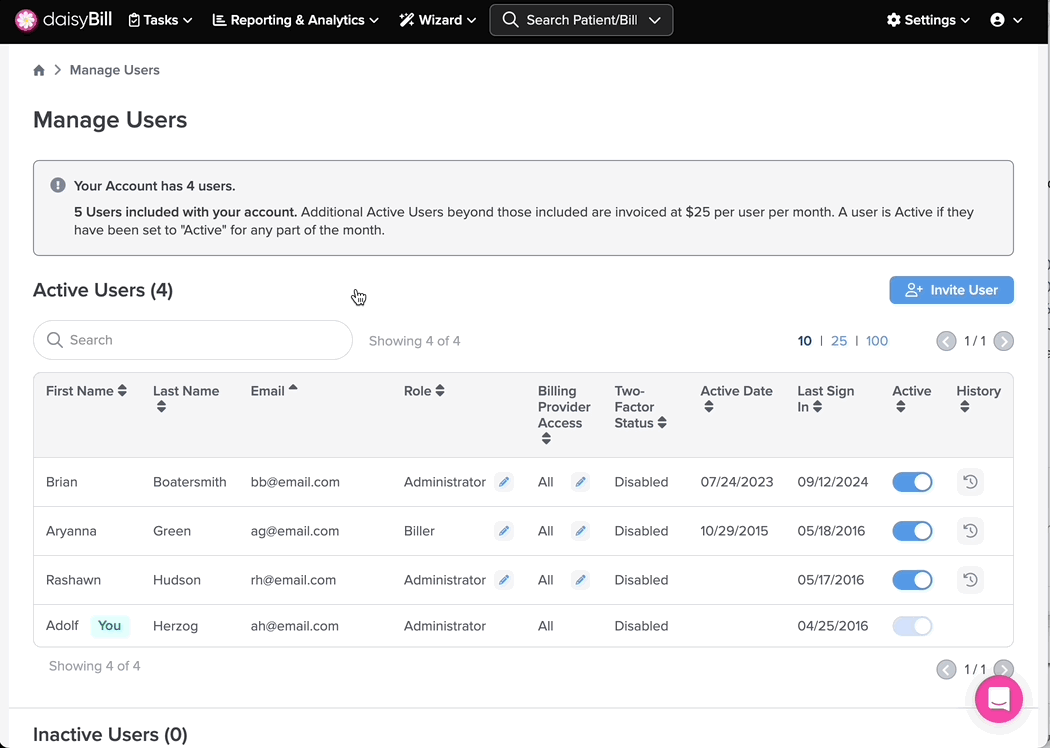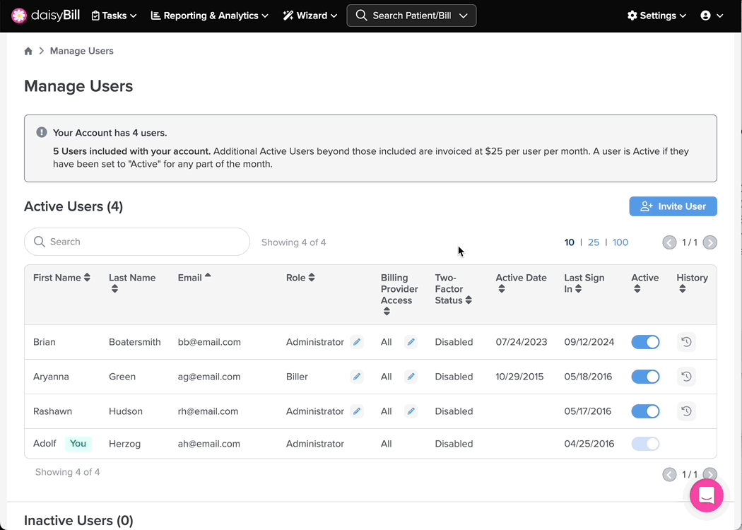 This section lists all Users with an Inactive status. An Inactive status indicates that the User does not have access to the daisyBill account.