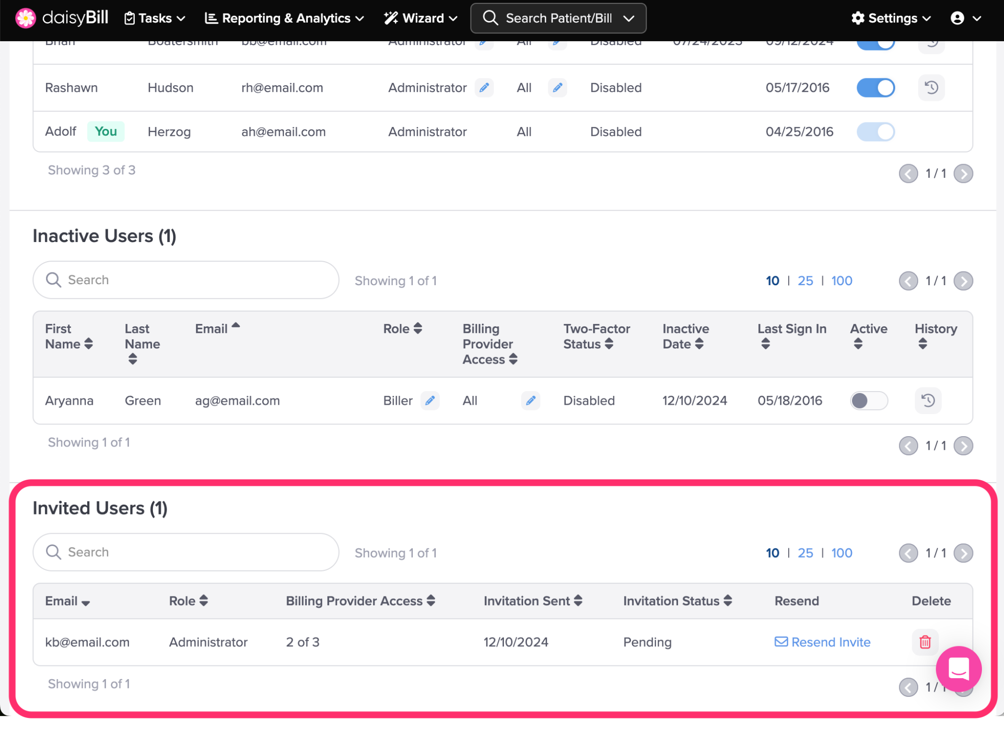 This section lists all Users with an Invited status. An Invited status indicates that the User has received an email invitation to join daisyBill.