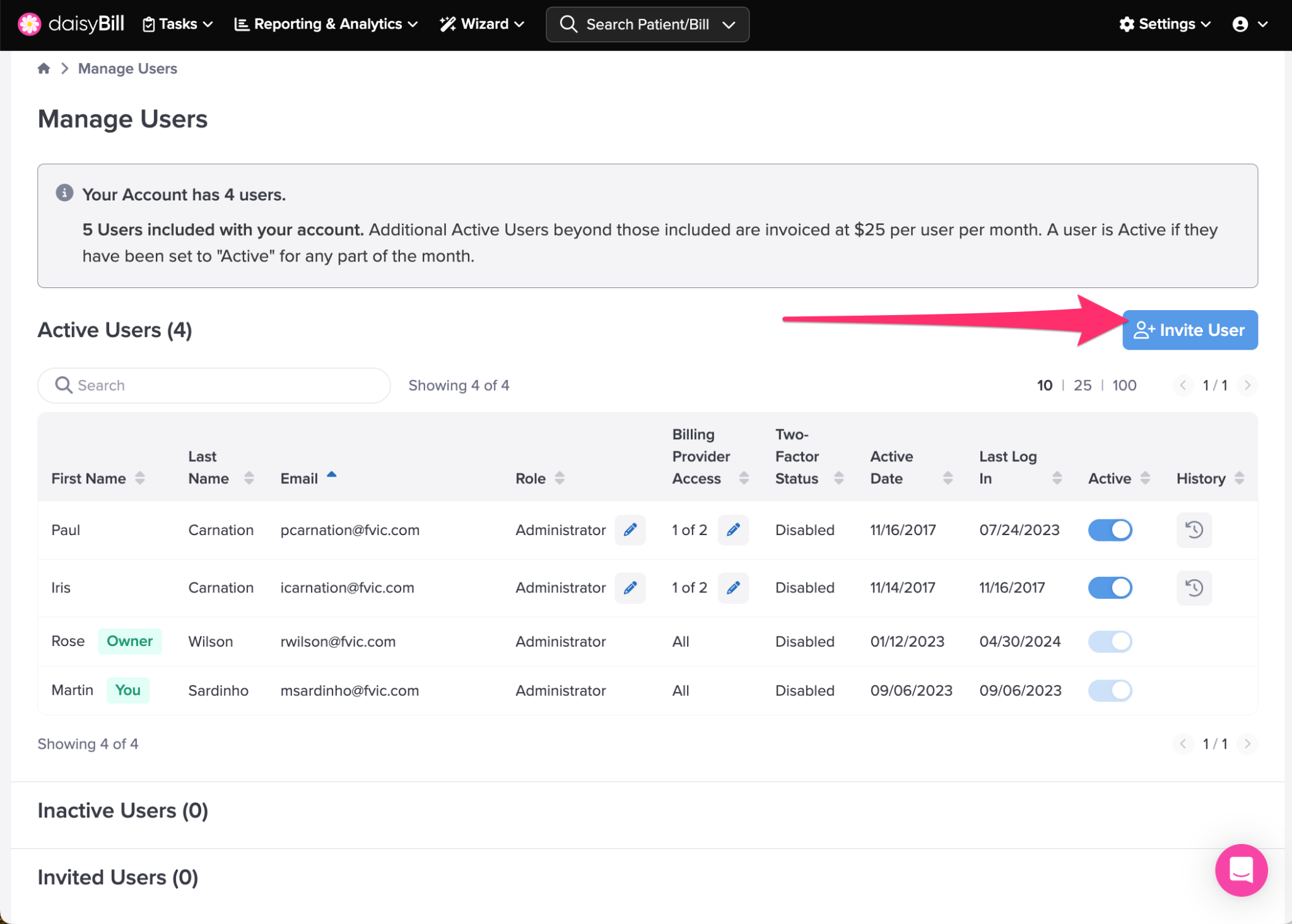 This setting shows all Users in your daisyBill account, grouped by status: Active, Inactive, and Invited.