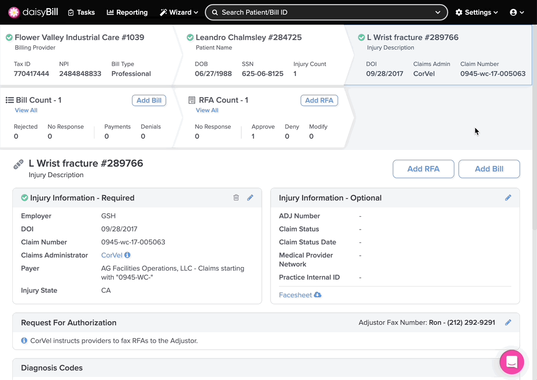 Need to see or change patient information? The Patient page is the right place! The Patient page displays important information for registered patients in your daisyBill account, including all their associated injuries.