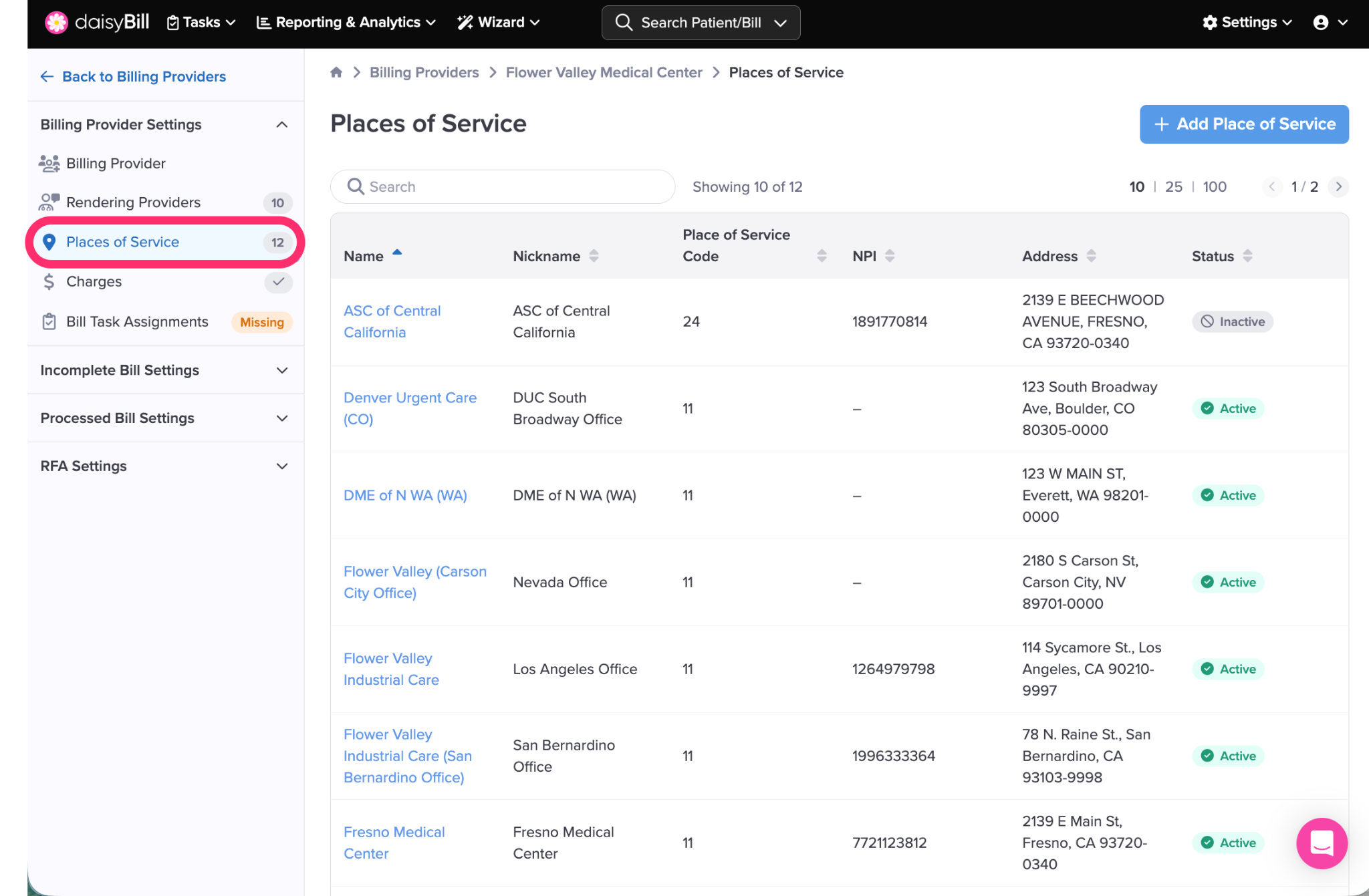 Step 3. To view or edit a ‘Place of Service,’ click its name.