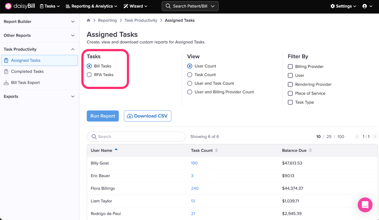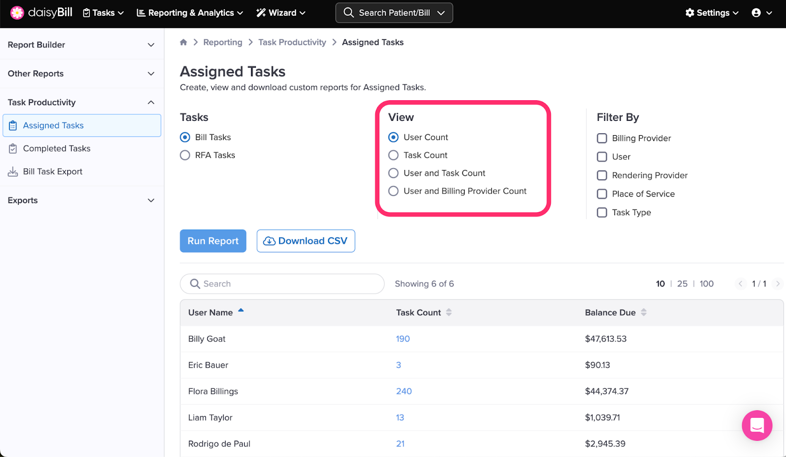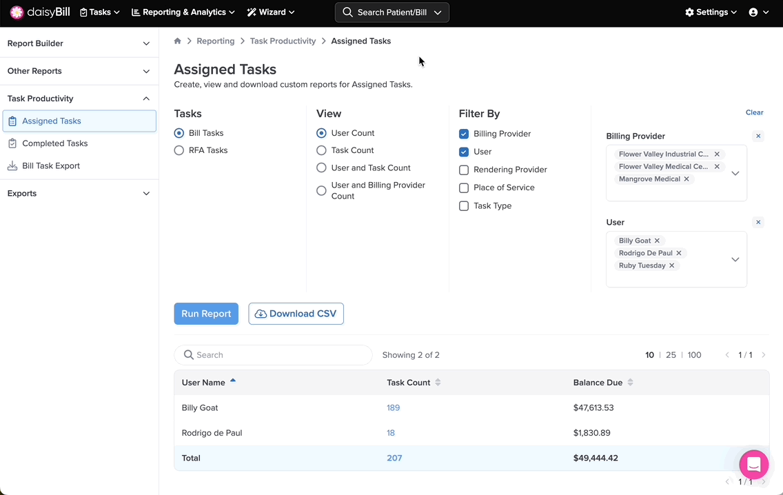 Select User and Billing Provider Count (when multiple Billing Providers exist) to view the count of assigned tasks by User Name and Billing Provider.