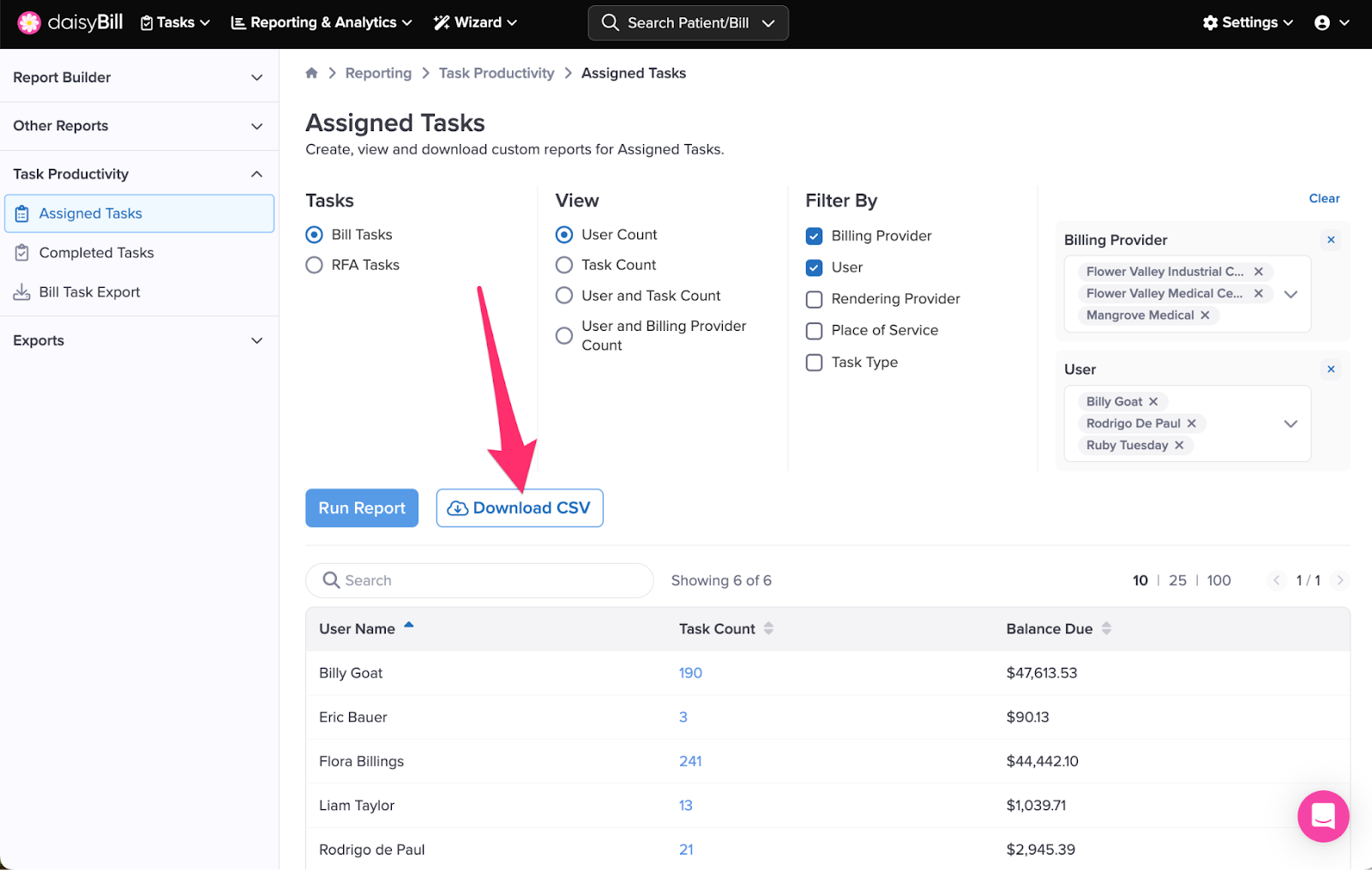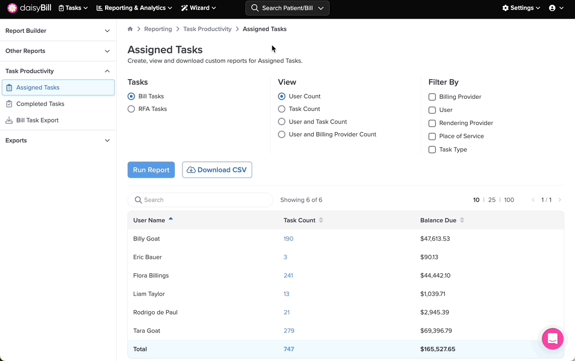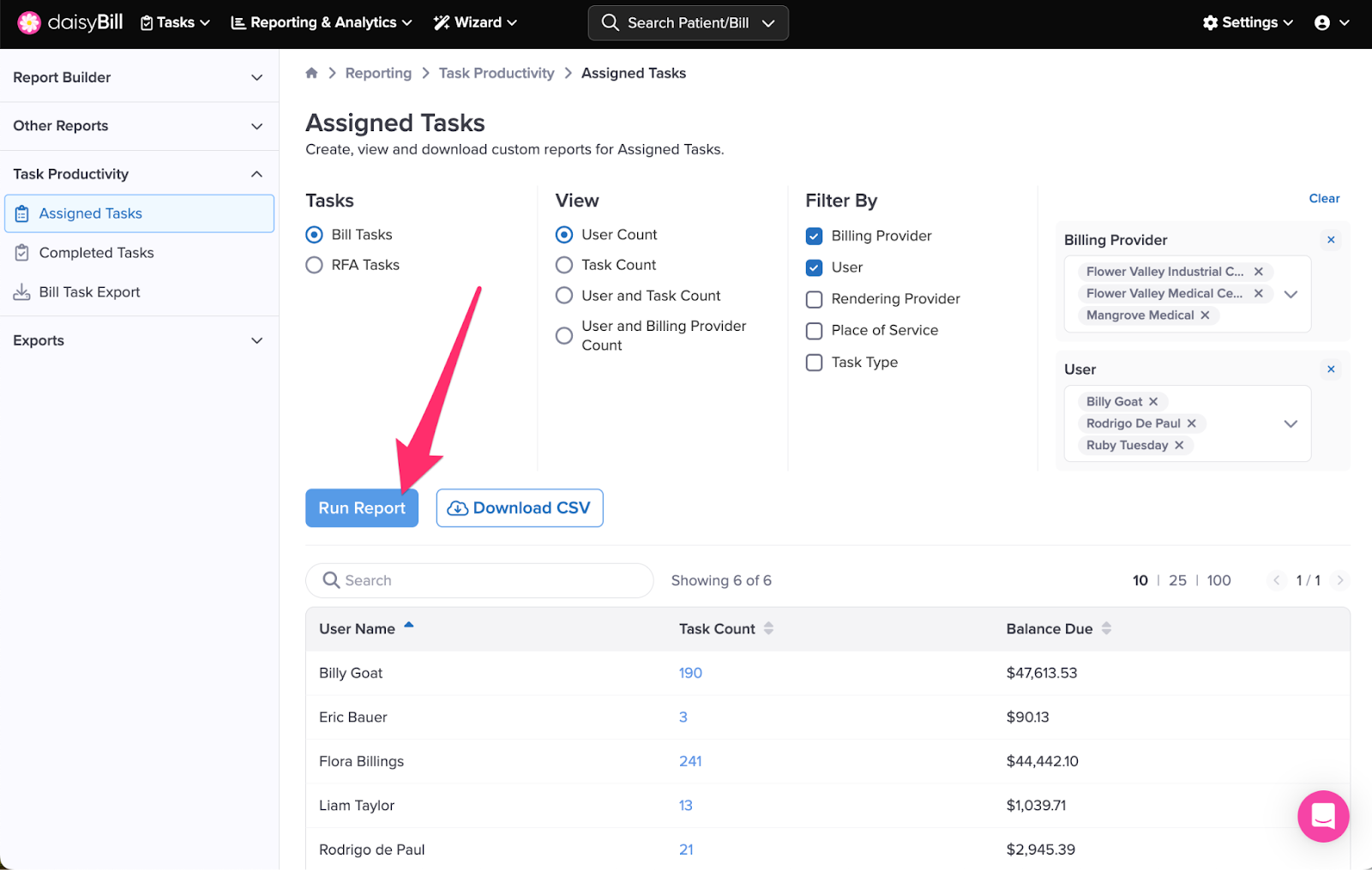 Select User and Billing Provider Count (when multiple Billing Providers exist) to view the count of assigned tasks by User Name and Billing Provider.