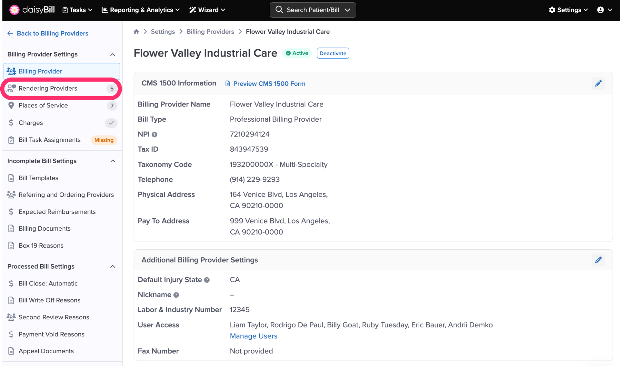 Step 1. On the navigation bar, click ‘Settings’, then click the name of the Billing Provider