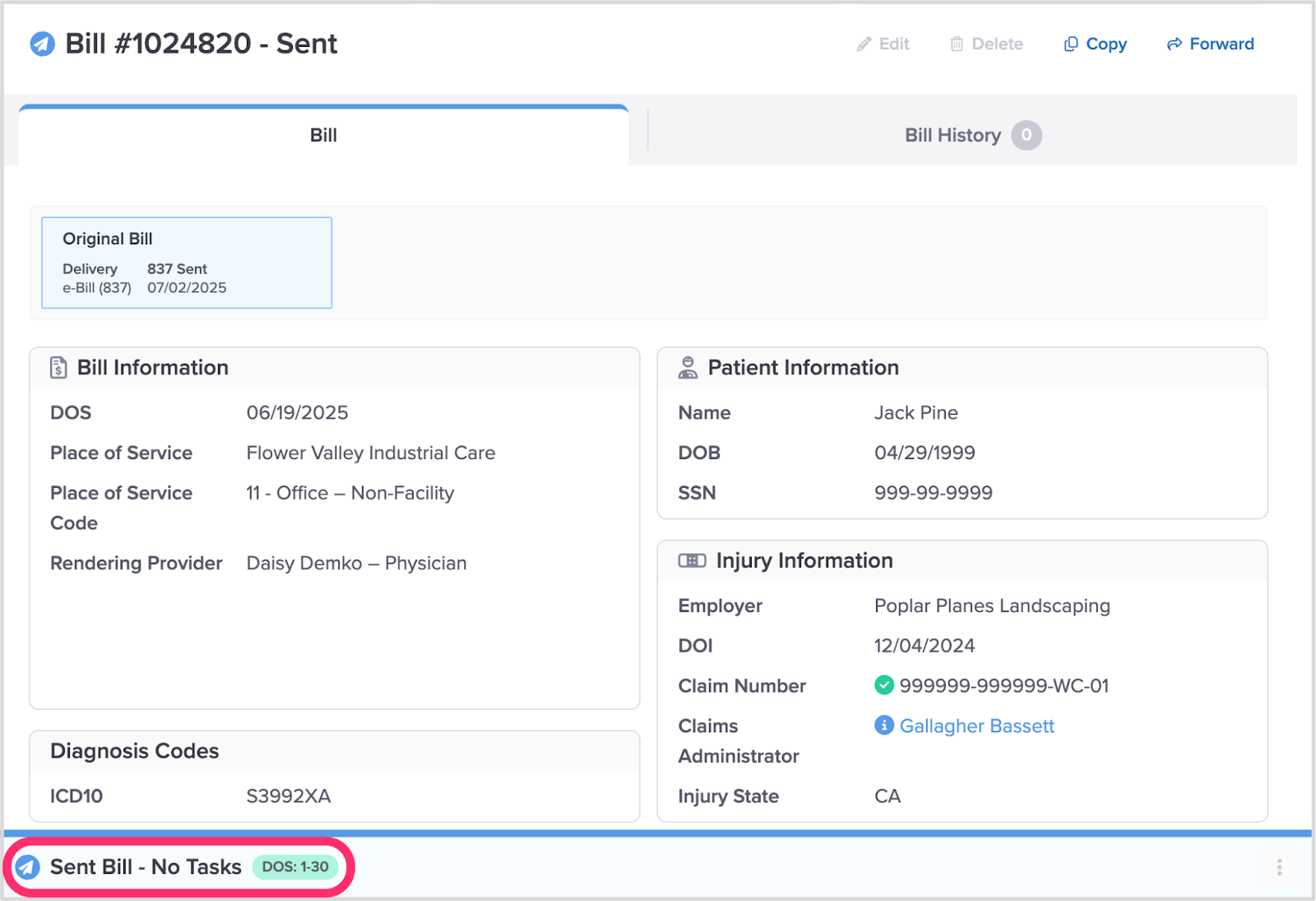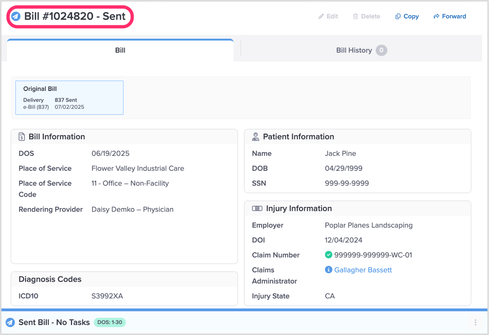 A bill assigned a Sent Status alerts you that daisyBill sent the bill to the payer.