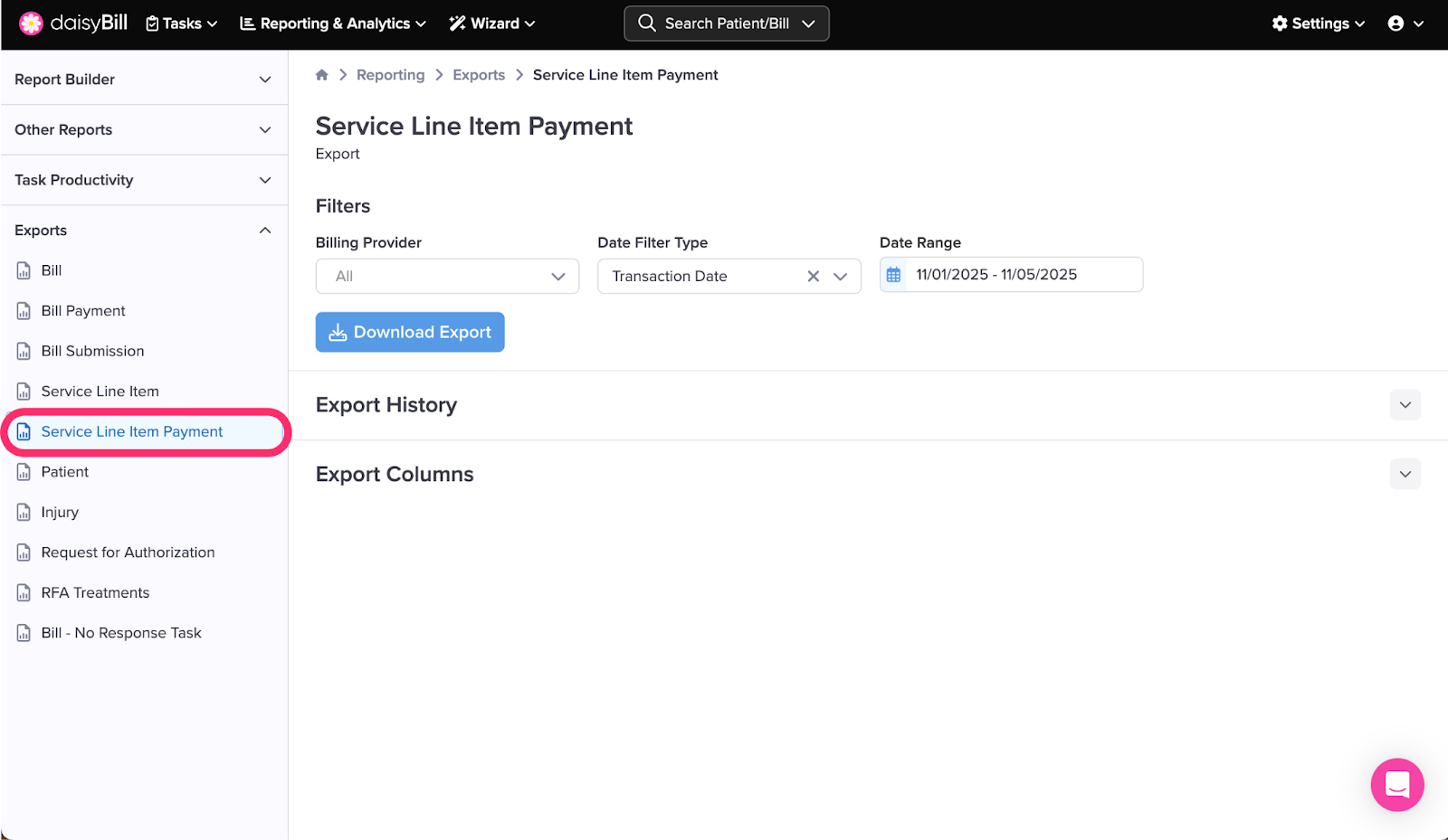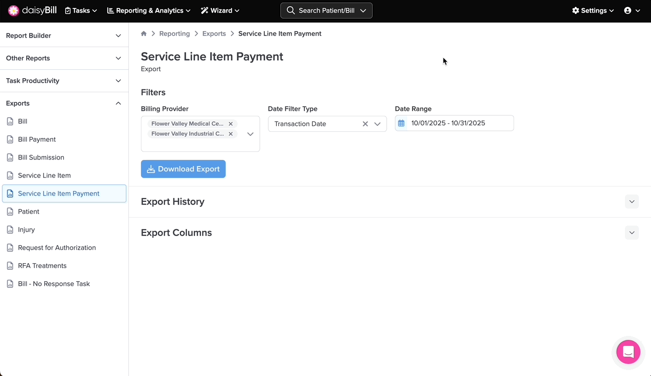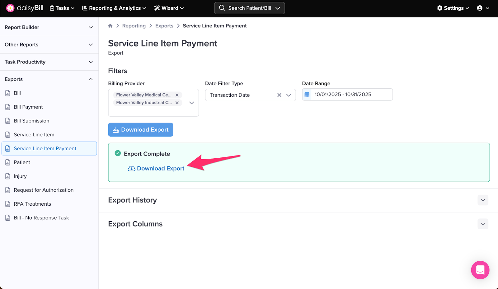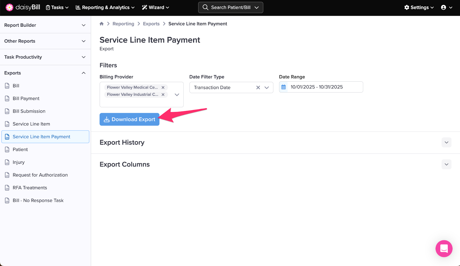 Step 8. To view previous Service Line Item Payment Exports, click ‘Export History’