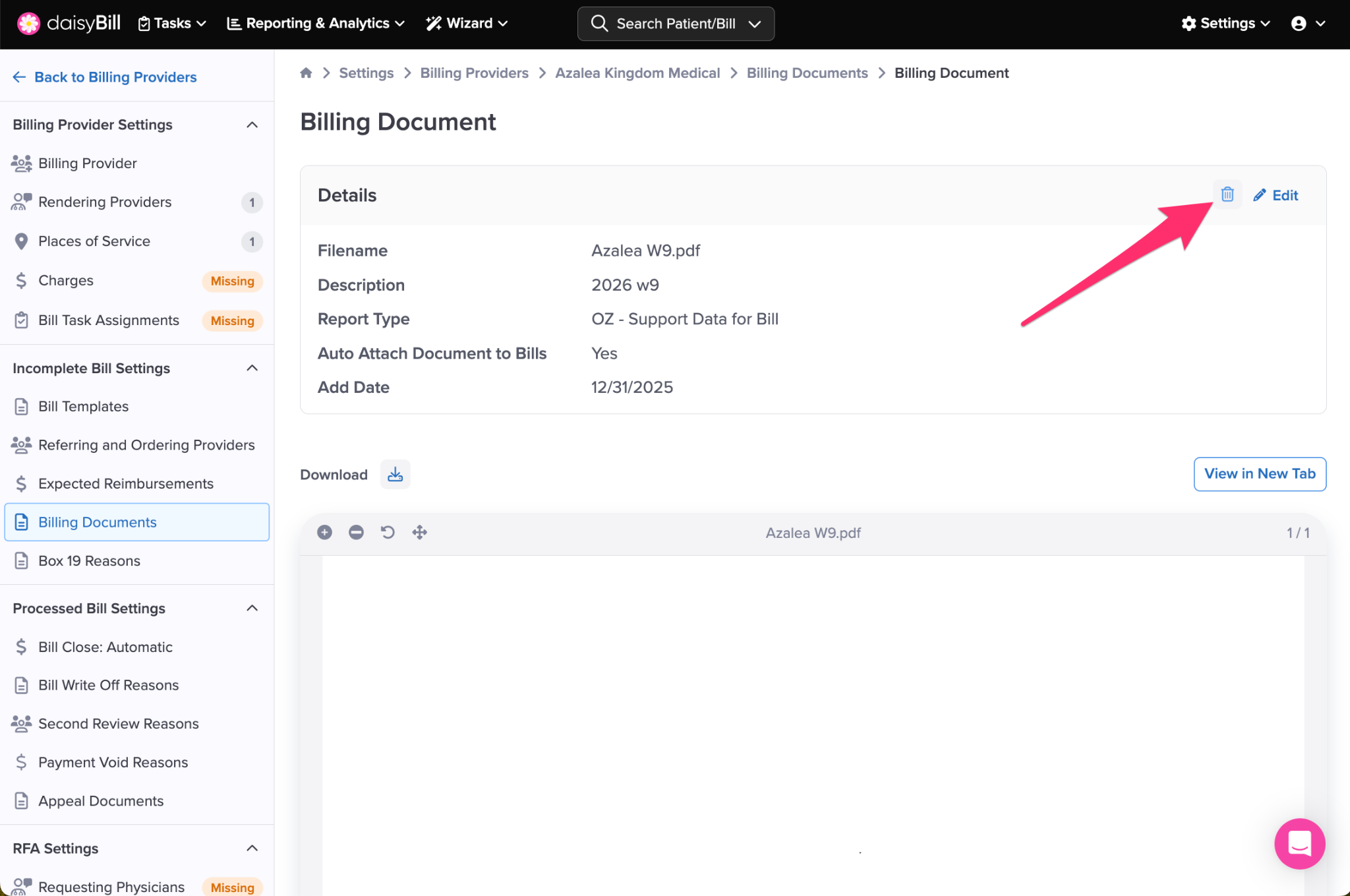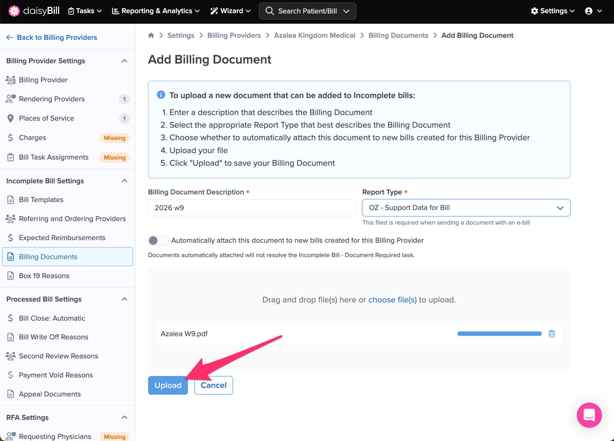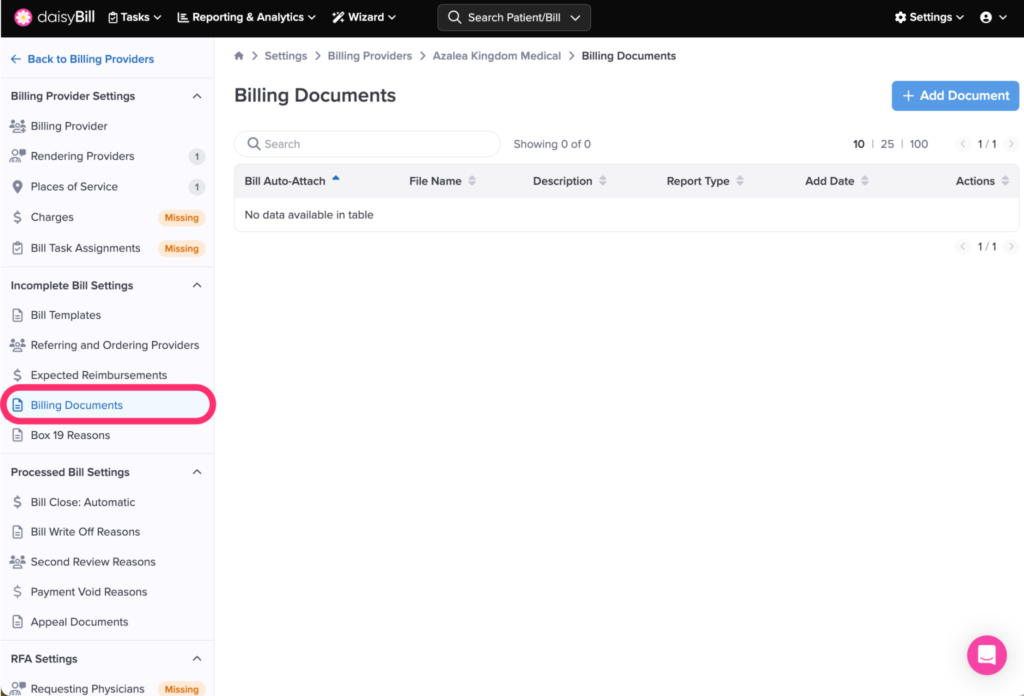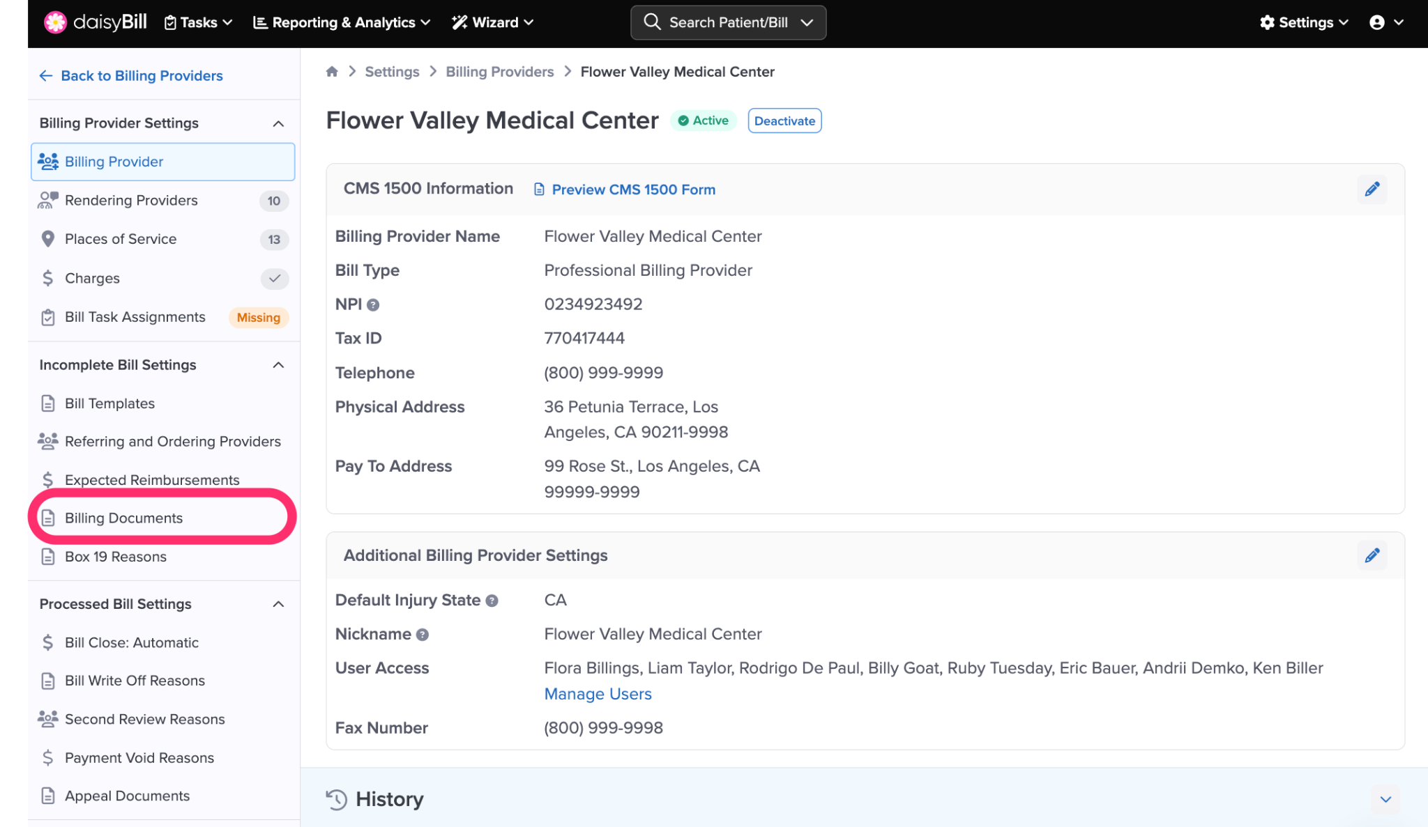 Step 1. On the navigation bar, click ‘Settings’, then click the name of the Billing Provider