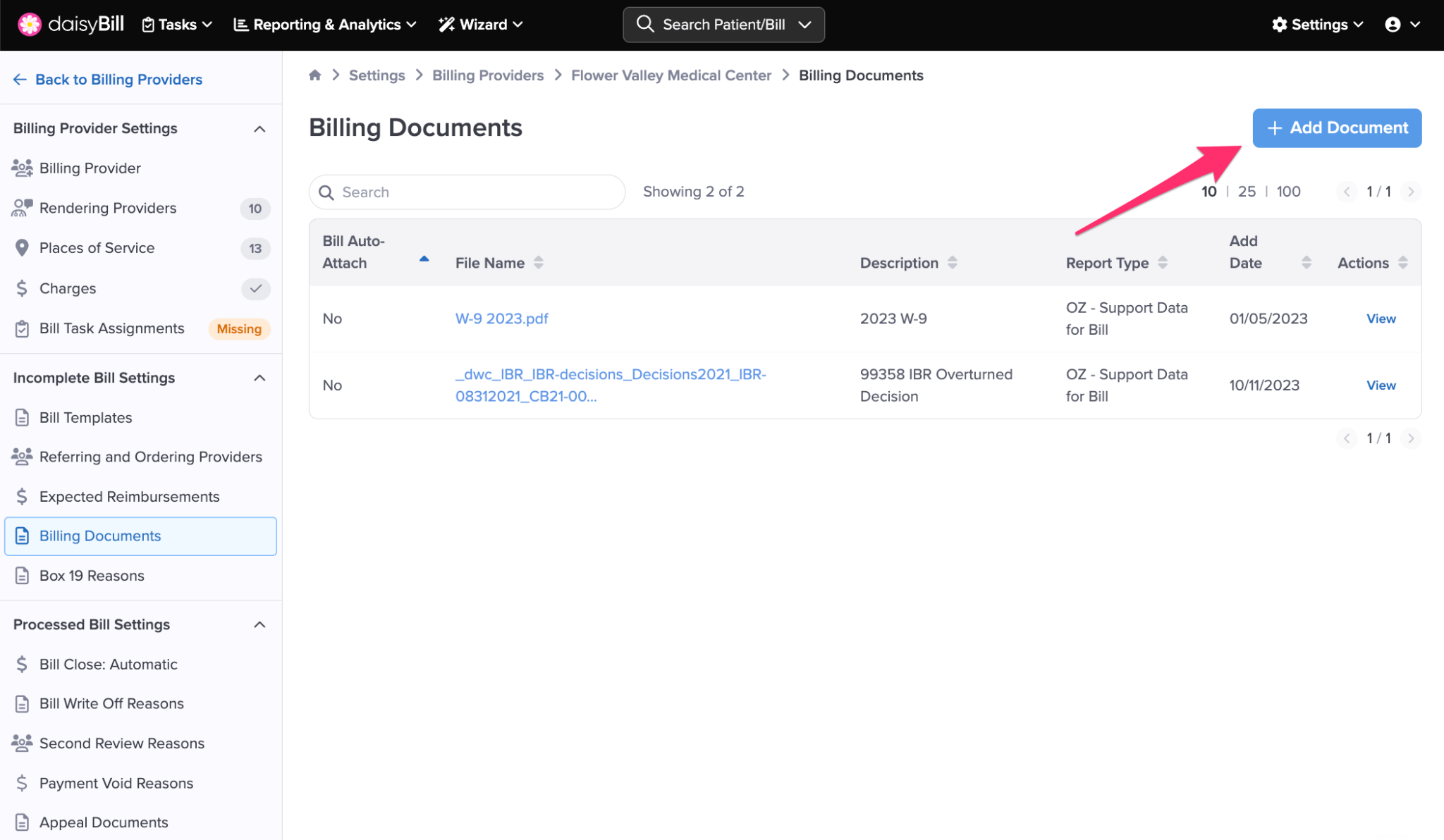 Billing Documents allows you to add and save important billing documents that are frequently required when sending bills for a Billing Provider, such as W-9 Forms, testing standards, and IBR Decisions.