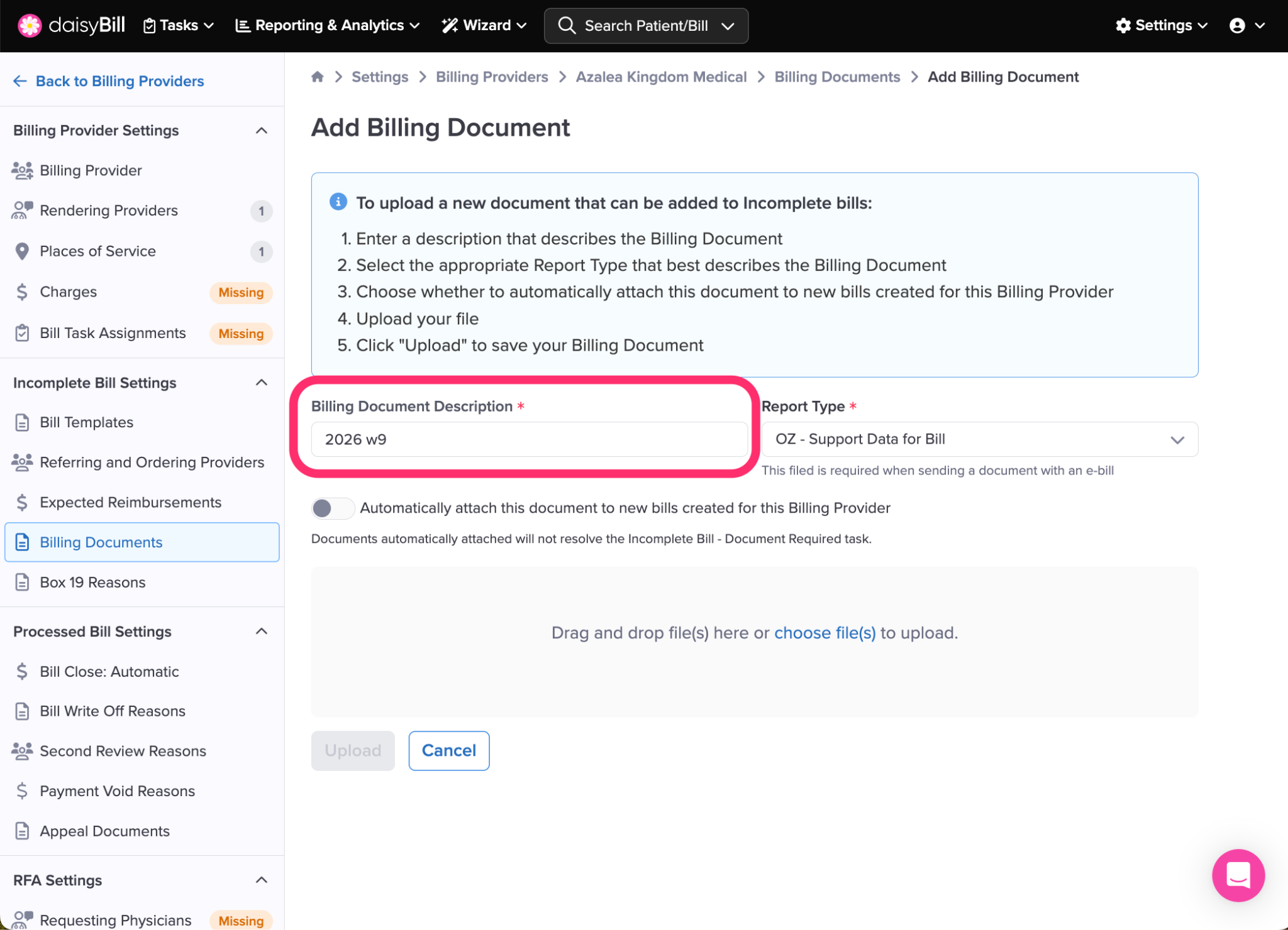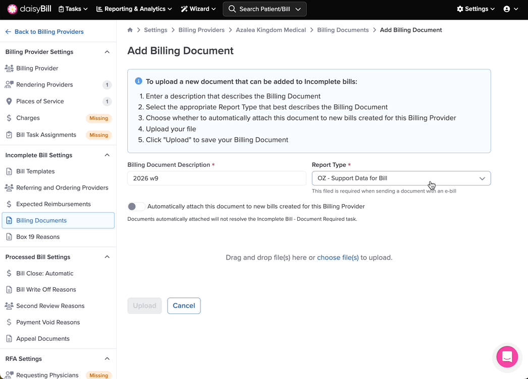If you wish to automatically attach this document to all new Bills, toggle the corresponding button.