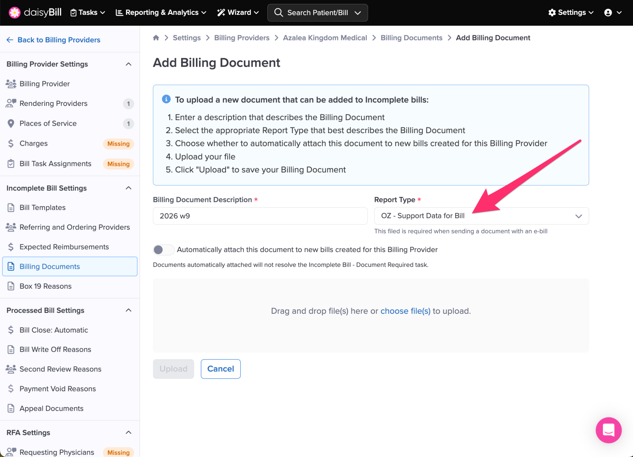The default Report Type is OZ-Support Data for Bill. In the Report Type drop-down list, select the most accurate Report Type.