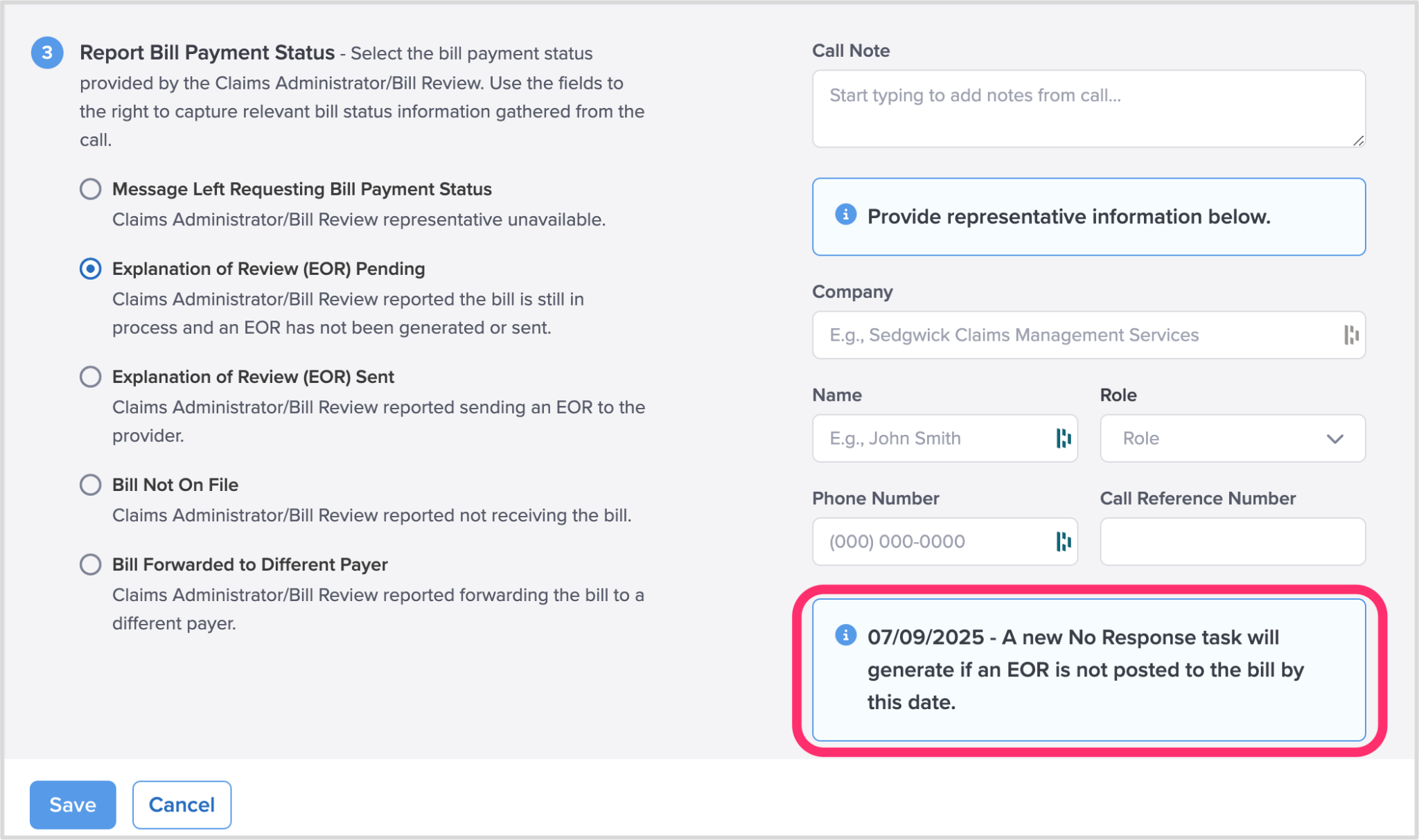 Each option prompts you to report key information from your call with the claims administrator.