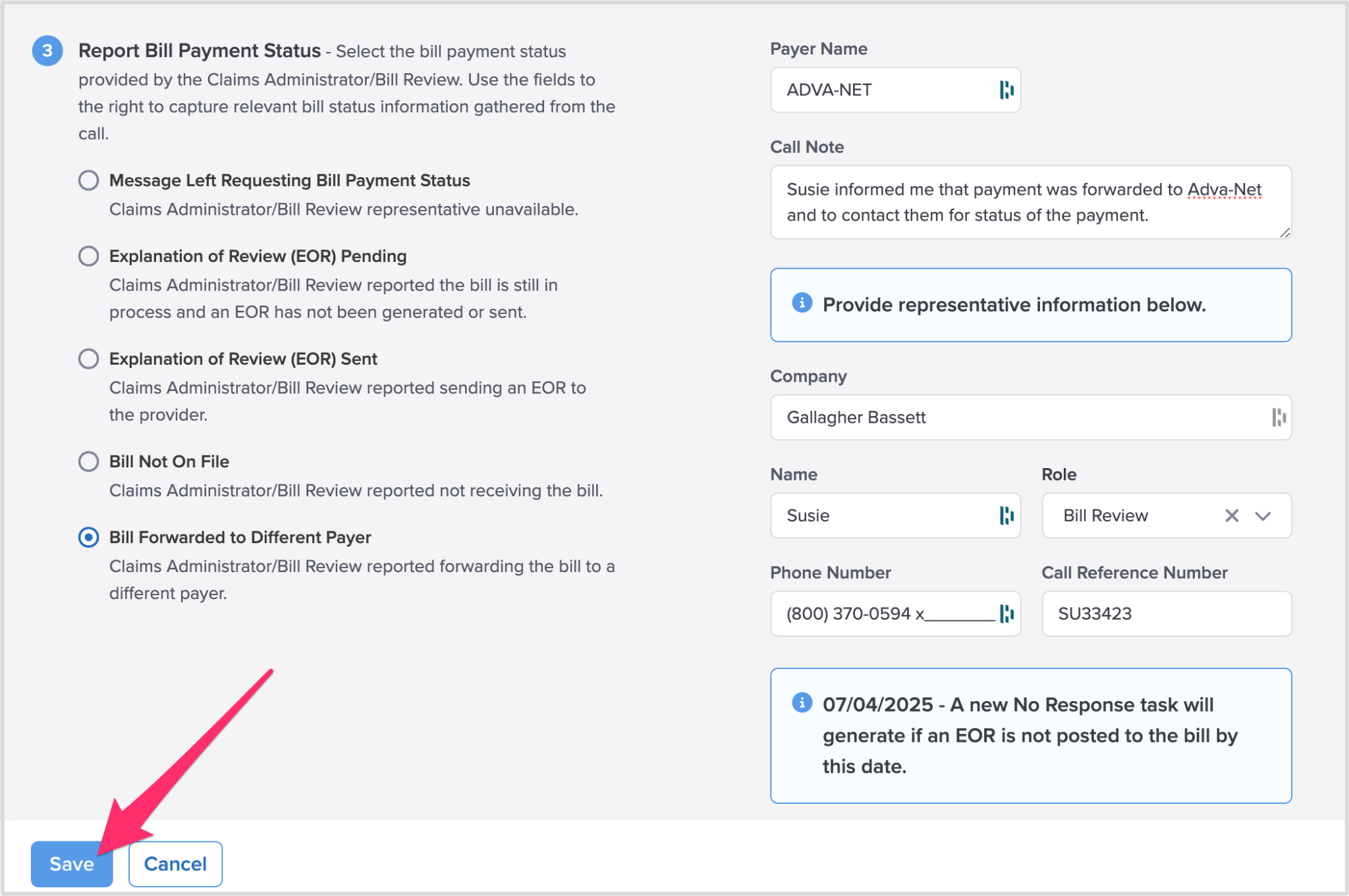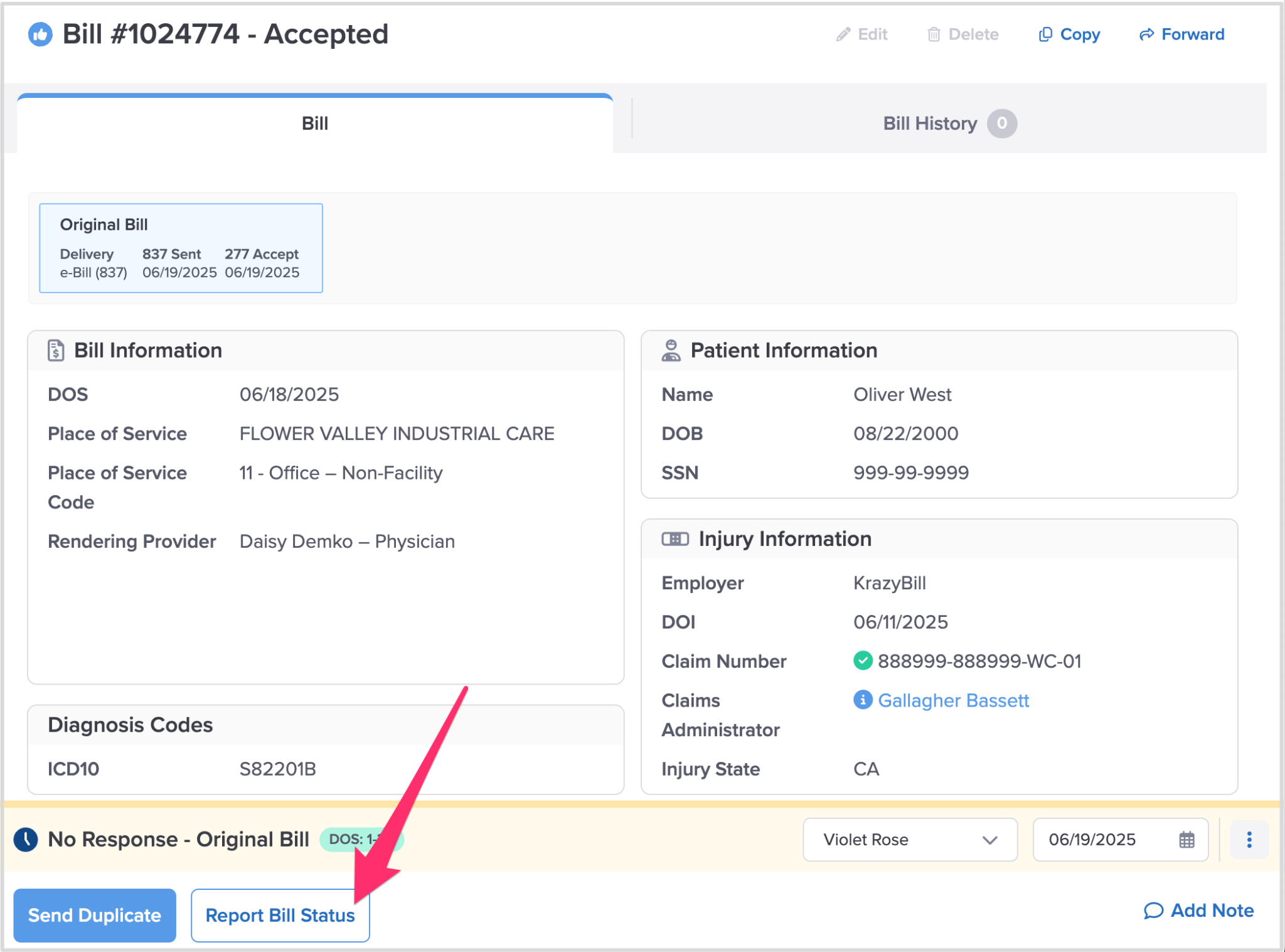 To complete the No Response - Original Bill task, click Report Bill Status to contact the claims administrator to determine why the bill has not been paid.