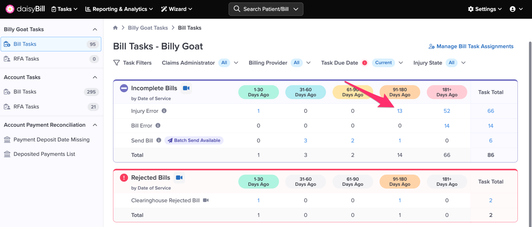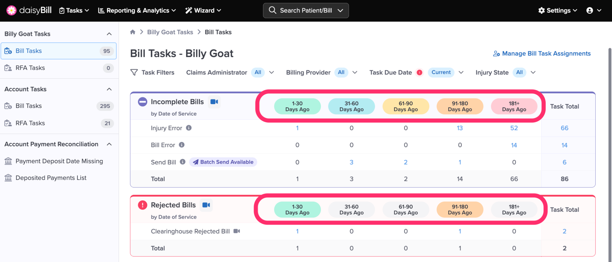 Click any Task Count to navigate to a list of bills with that Task.