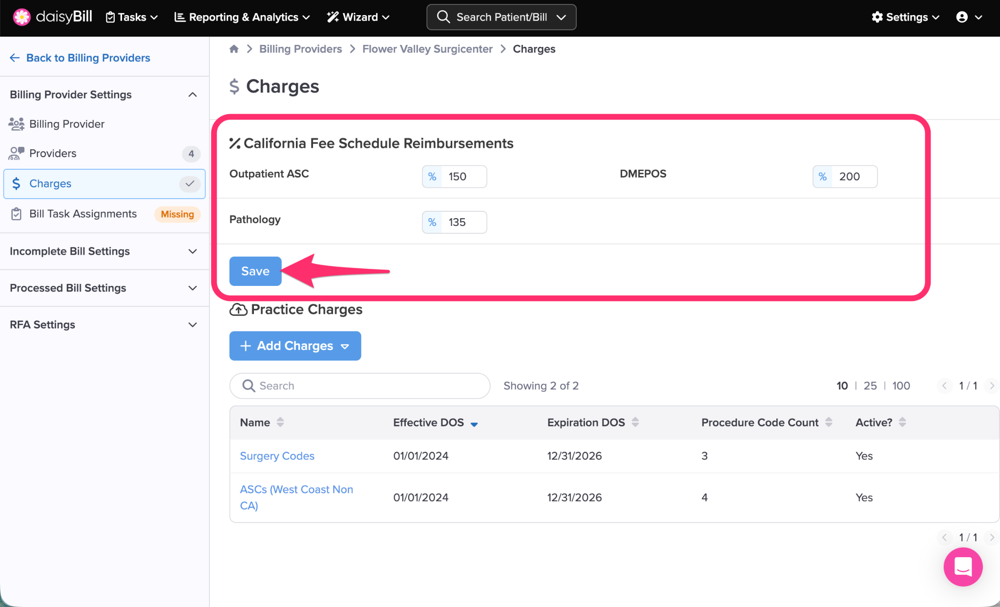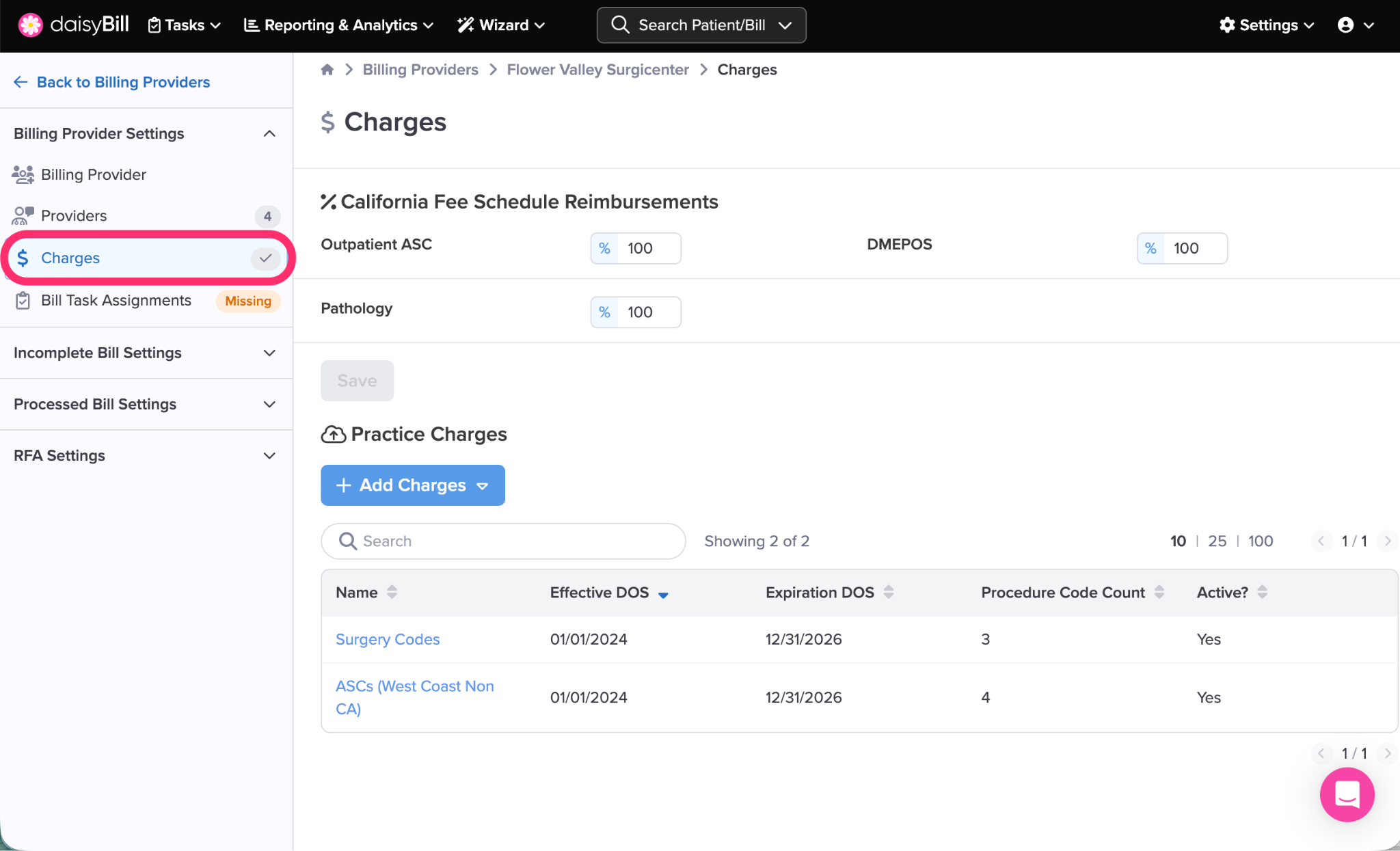 In Charges, set the percentage of the state fee schedule (if available), or create your own Charges for all or some of the services you bill.