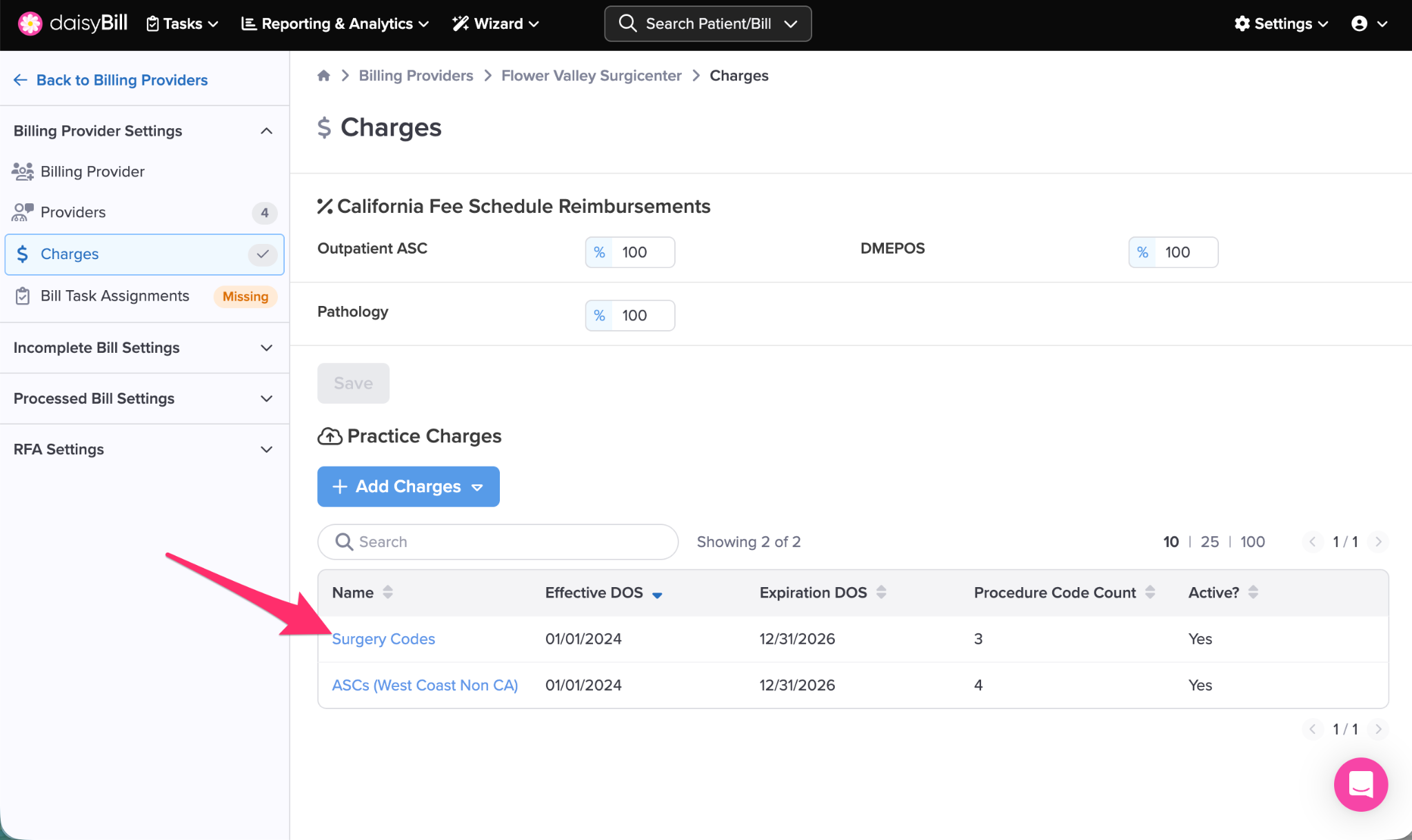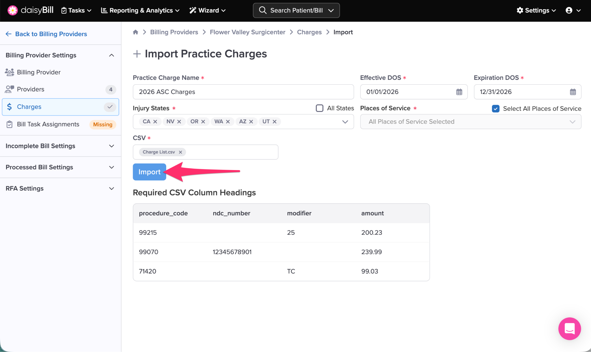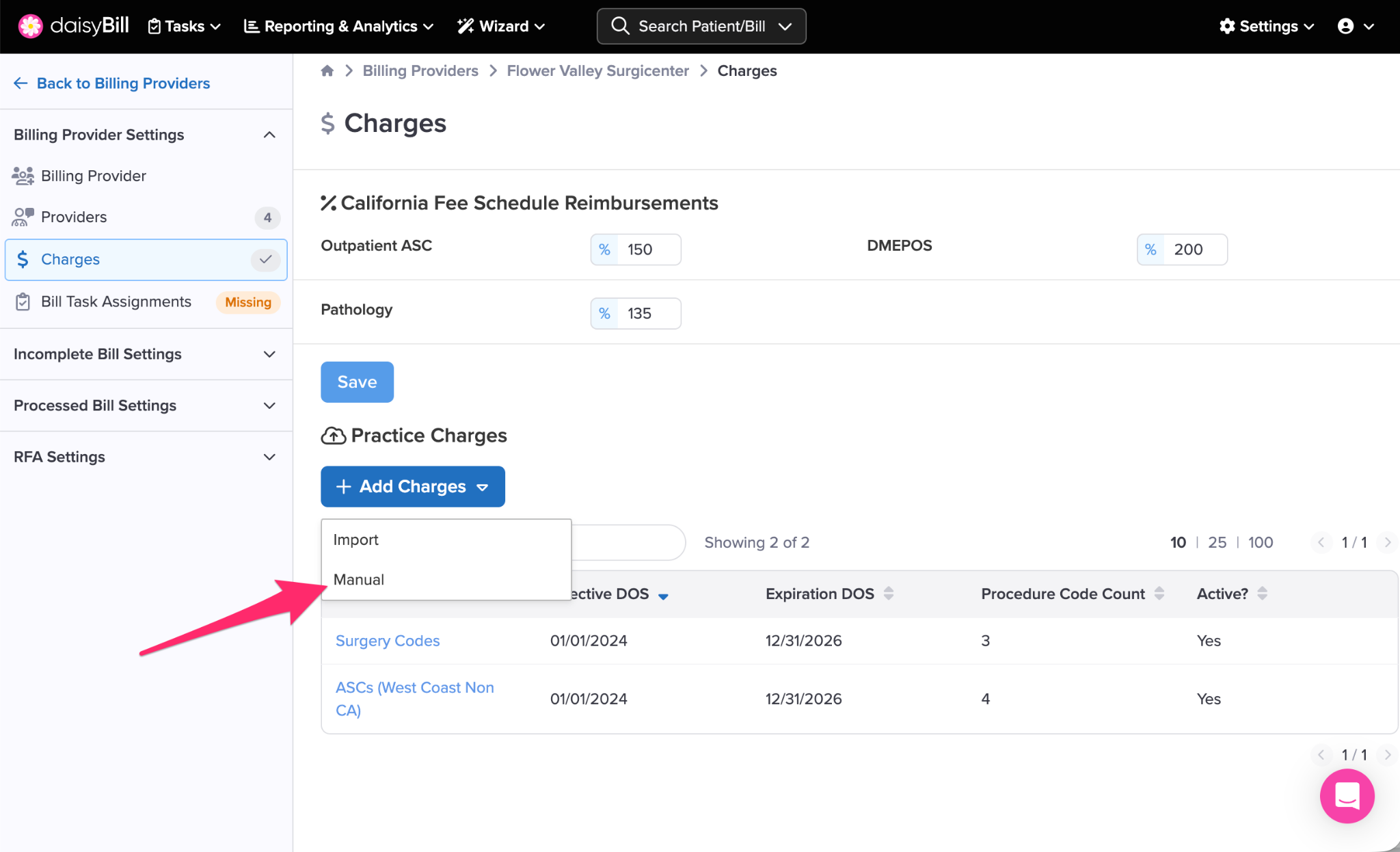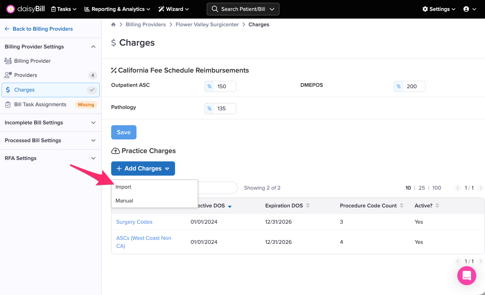 If you don’t see this option, it’s because daisyBill is still working on your state’s fee schedule!  Follow the steps below to import or create your own Practice Charges.