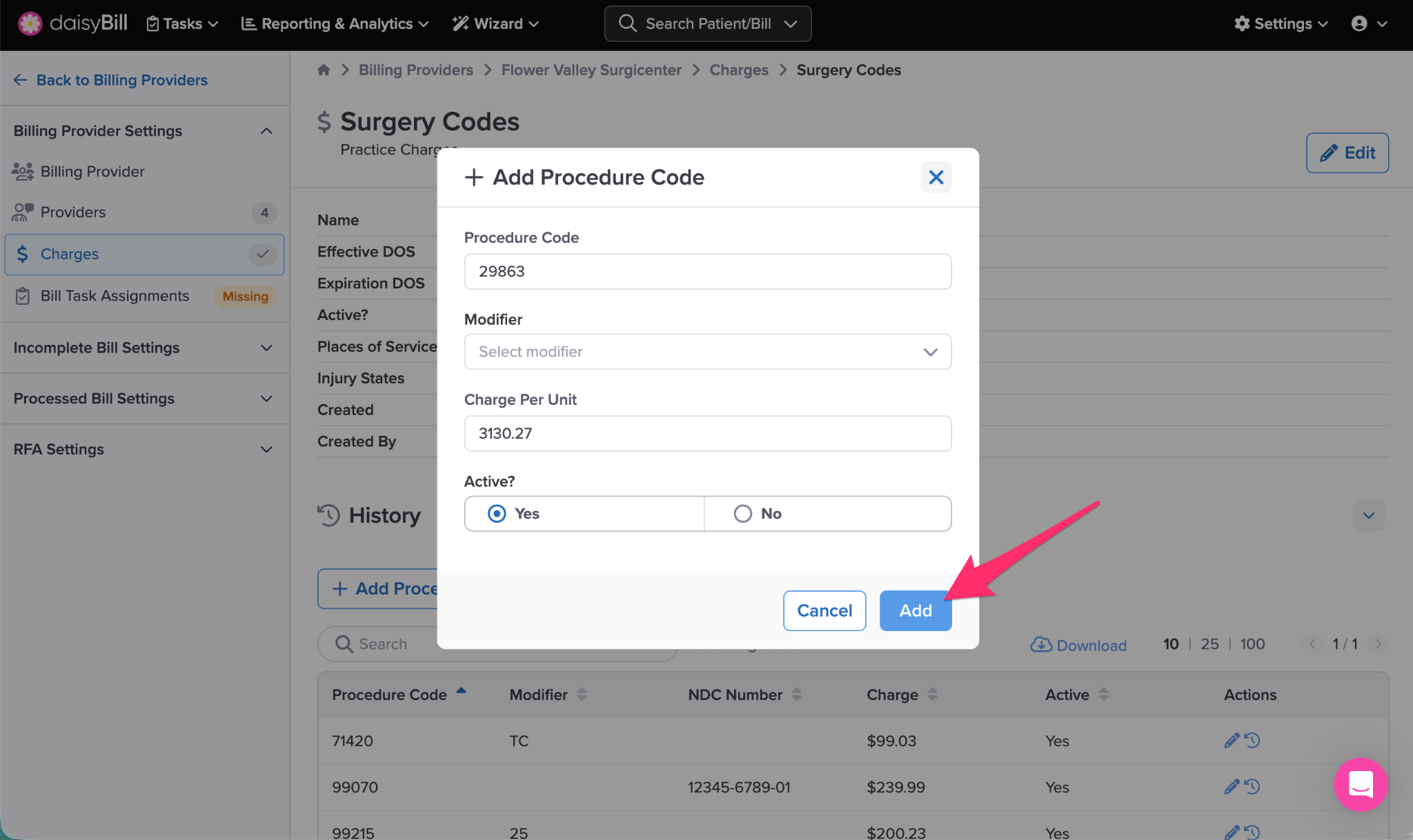 Step 11. Enter the ‘Procedure Code’, ‘Modifier’ (if applicable), and ‘Charge Per Unit’, then click ‘Add’
