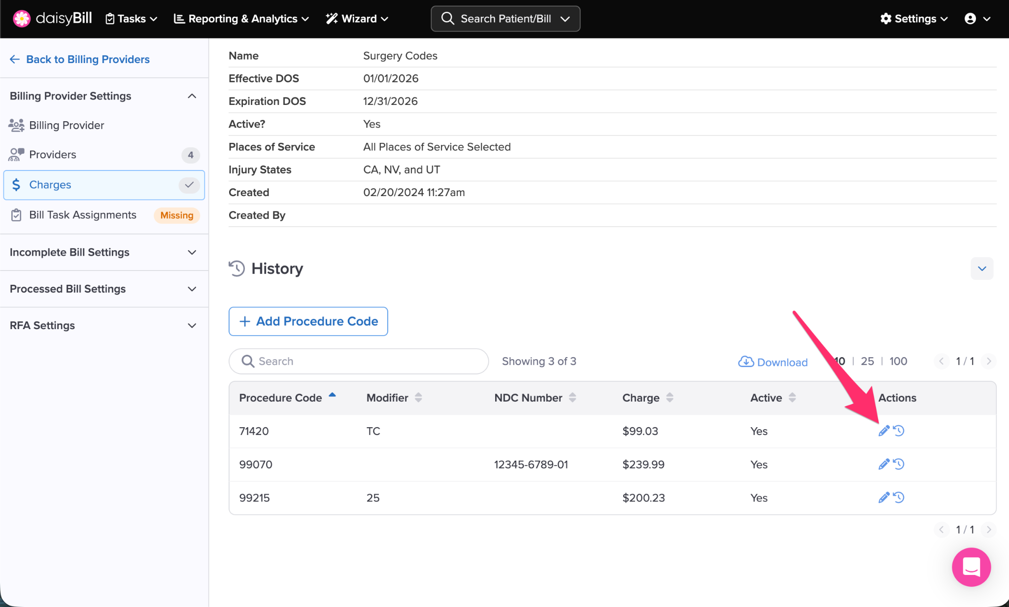 Step 18. To edit a ‘Procedure Code’, click the ‘Pencil’ icon