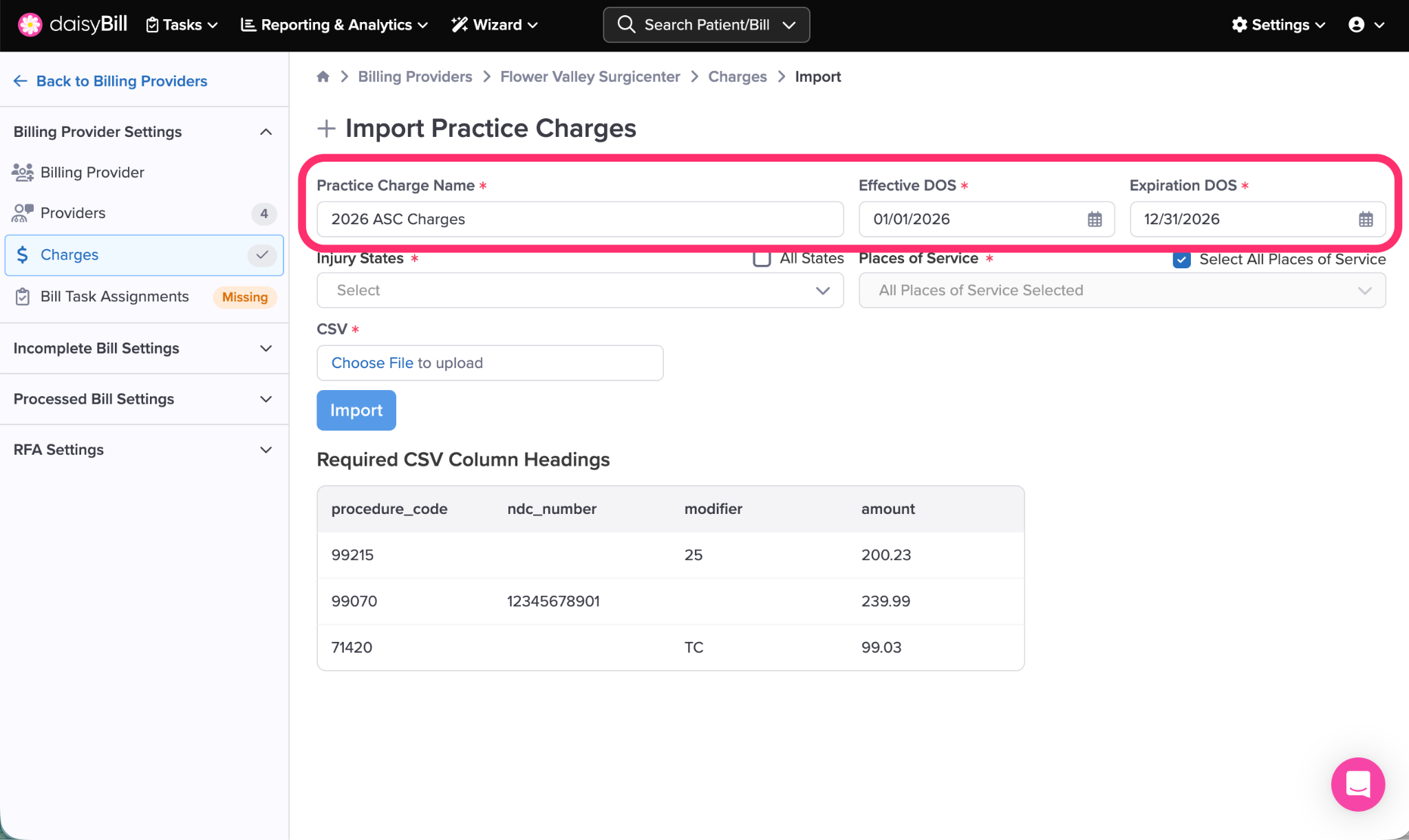Note: The CSV file MUST use the column headings ‘procedure_code’, ‘supplemental_data’, ‘modifier’, and ‘amount’.