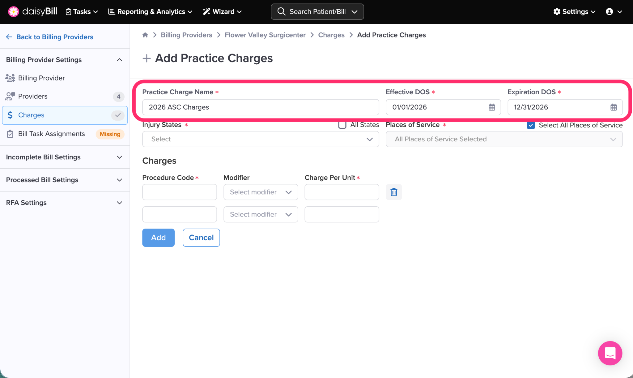 Step 5. Enter the ‘Practice Charge Name’, ‘Effective DOS’, and ‘Expiration DOS’