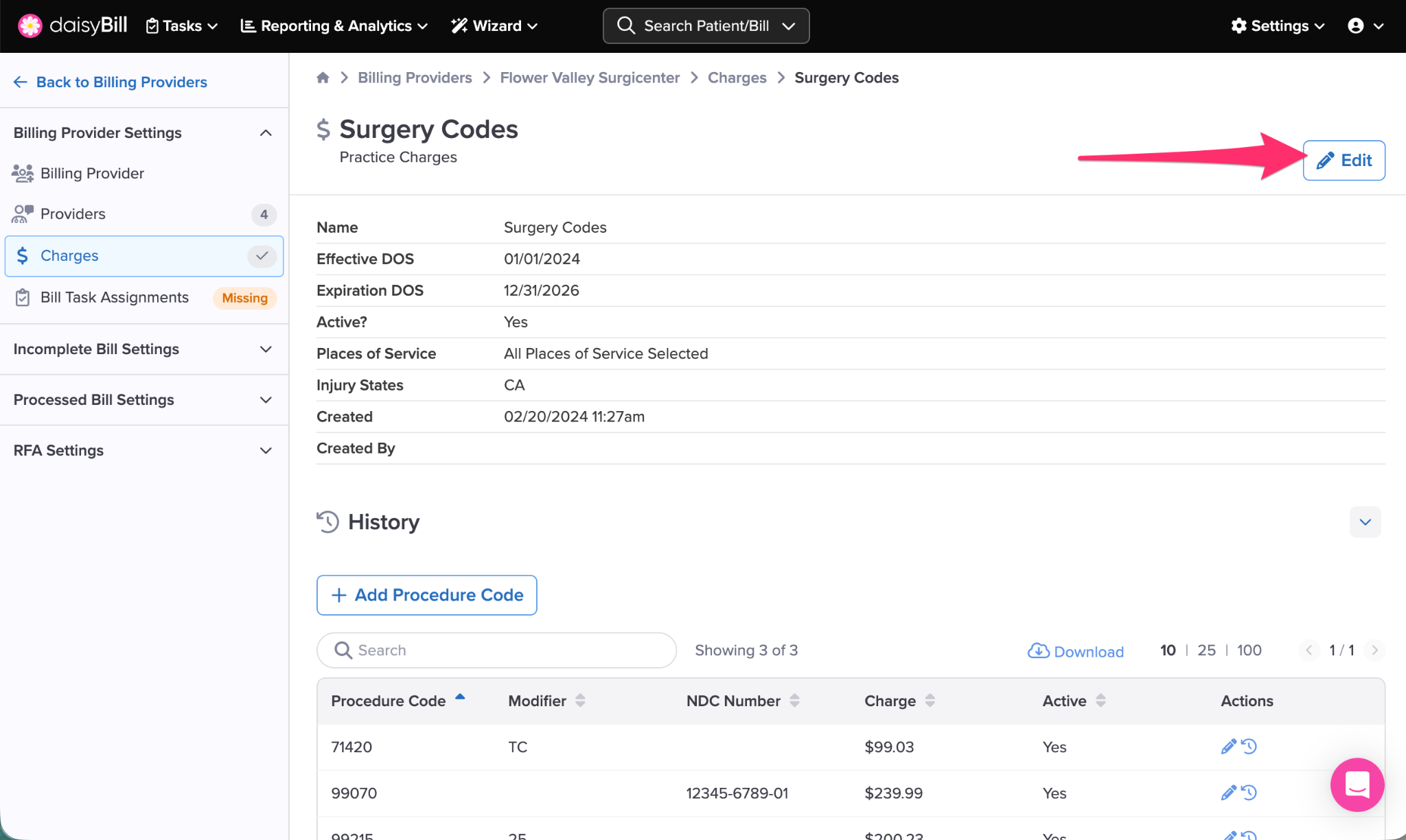 Step 13. To edit a ‘Practice Charge’, click ‘Edit’