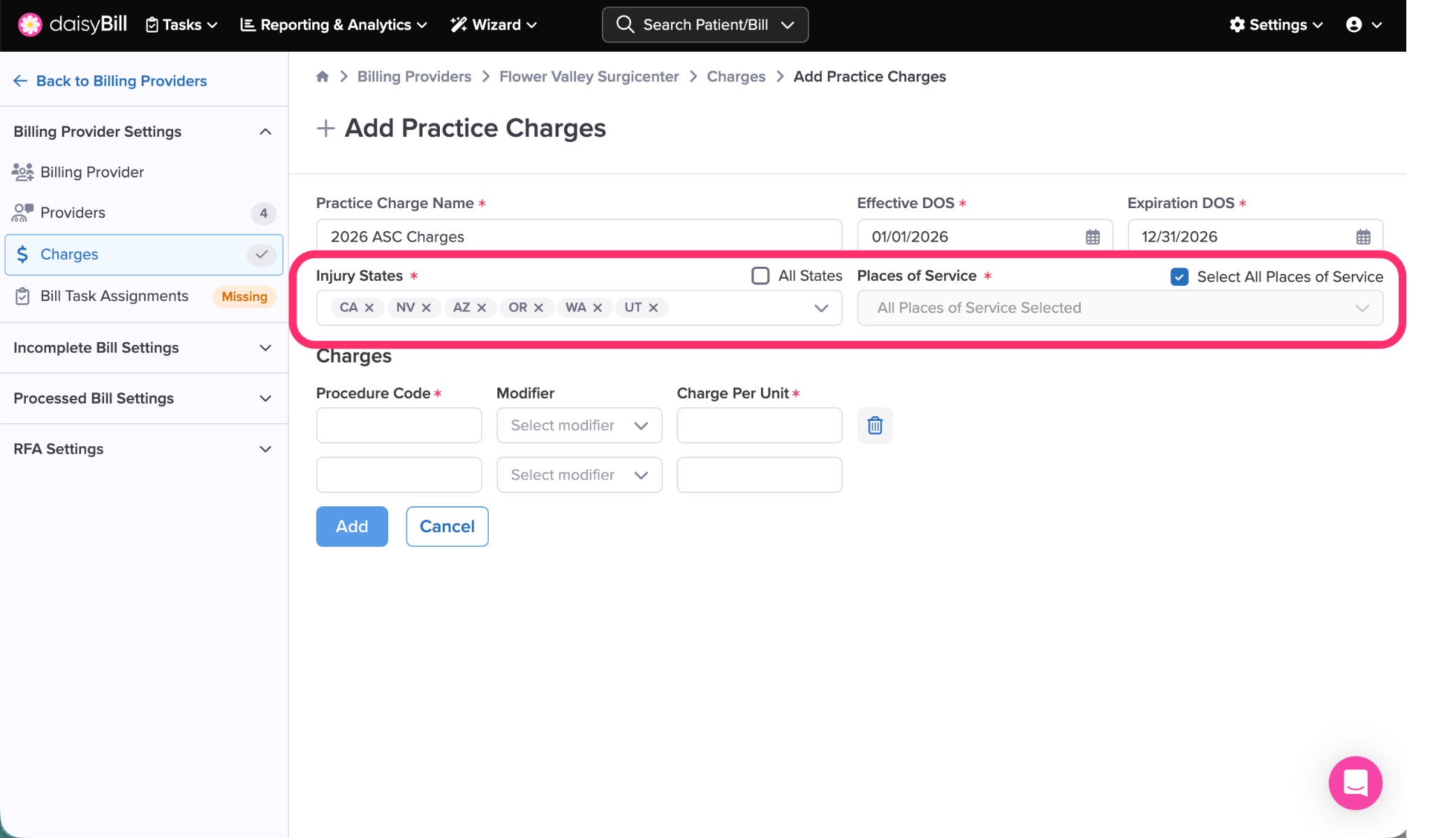 Step 6. Select the Injury States and Places of Service the charges will apply to